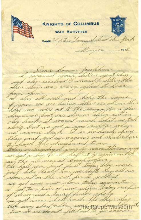 Envelope is a heavy tan paper with Knights of Columbus logo in the left corner addressed to "Miss Josephine Raupp; Arlington Heights, Ills." Postmarked May 13, 1918 from Brooklyn Upton Branch. Envelope has purple adhesive three cent stamp.Archive Details
