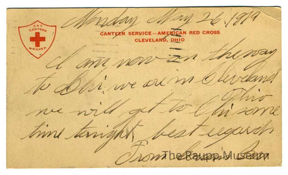Tan postcard. Front is addressed to Miss Josephine Raupp Arlington Heights, IL. Posted from Fort Wayne Indiana 1919 with a red 2 cent stamp. Back has an outline of a red shield logo in upper left corner for Red Cross Canteen service and “Canteen Service- Red Cross Cleveland Ohio" across the upper center. Handwritten message in black ink.Archive Details