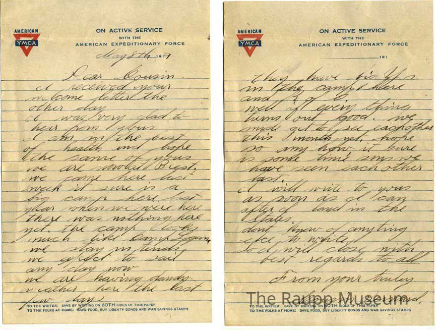 Two pages of a correspondence on American YMCA letterhead with envelope. Red and blue YMCA logo in upper left corner with “On active Service with the American Expeditionary Force” across the center of the paper. Dated May 8th 1919. Lined paper with note at the bottom: "to the writer: save by writing on the sides of this paper; to the folks at home: save food, buy liberty bonds and war saving stamps."