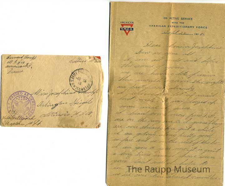 Handwritten address on the front of envelope: from Bernard Raupp [illegible] American EF, France" to "Miss Josephine Raupp Arlignton Heights, Illinois USA." With US Army Post Office stamp and purple censor stamp with a handwritten "OK."Archive Details