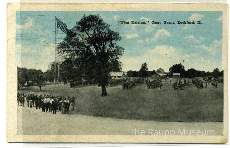 Color postcard of the “Flag Raising” at Camp Grant, Rockford, IL. Photo is predominantly black and white with exception of the blue-sky background. With images of lines of men facing the American flag on the flagpole. Back of the postcard has a poem on the upper left side in green: "Beloved of our country! The message we;send;From realms where the hopes of the patriots; blend; with prayers of the martyrs who suffer for; you; In unity stand by the Red, White and Blue."