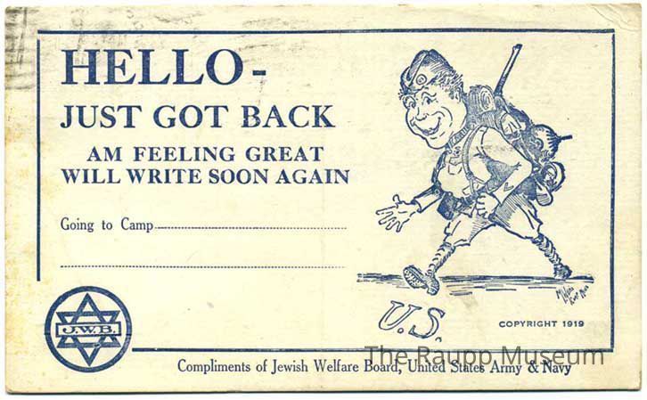 White postcard with blue border with blue text on left side “Hello- Just got back am feeling great will write soon again going to camp----.“ The right side has an image of a cartoon soldier walking. Underneath the border is a JWB logo in a circle. “Compliments of the Jewish Welfare Board, United States Army and Navy."