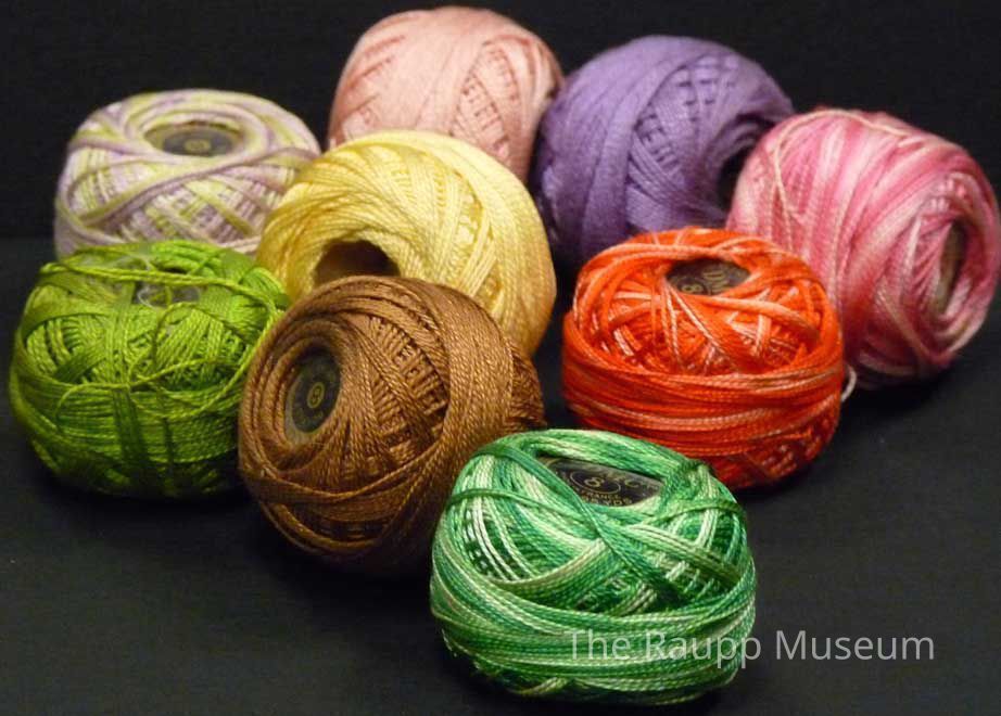 Group of nine balls of multi-colored cotton crochet thread in various colors.