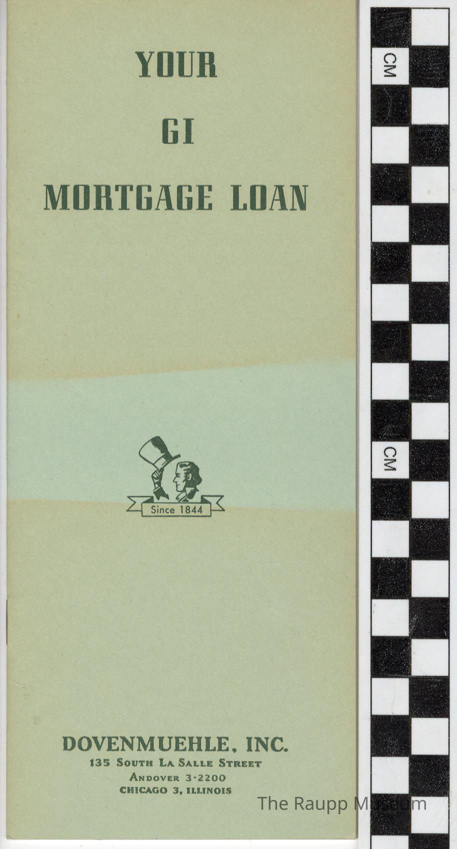One (1) informational booklet about GI Mortgage Loans, titled "Your GI Mortgage Loan", printed by Dovenmuehle, Inc. There is a picture of a man lifting his top hat on the cover with a banner underneath that says "since 1844". The booklet has a green cardstock cover with green printed text, and white paper with black printed text inside. There are 16 pages. There are two staples on the left side of the booklet. The booklet lists important information about the loan and buying and maintaining a house process.Archive Details
