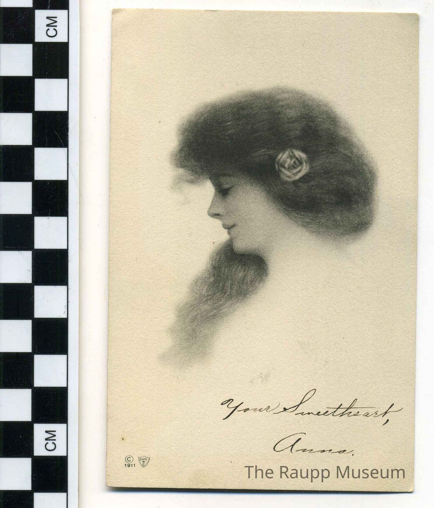 Postcard with black and white illustration on the front and postcard text on the reverse. Front illustration of a 1911 portrait of a woman with long fluffy hair and a rose in her hair. Handwritten text in lower right corner "Your Sweetheart, Anna." Lower left corner copyright 1911 and printer shield logo.