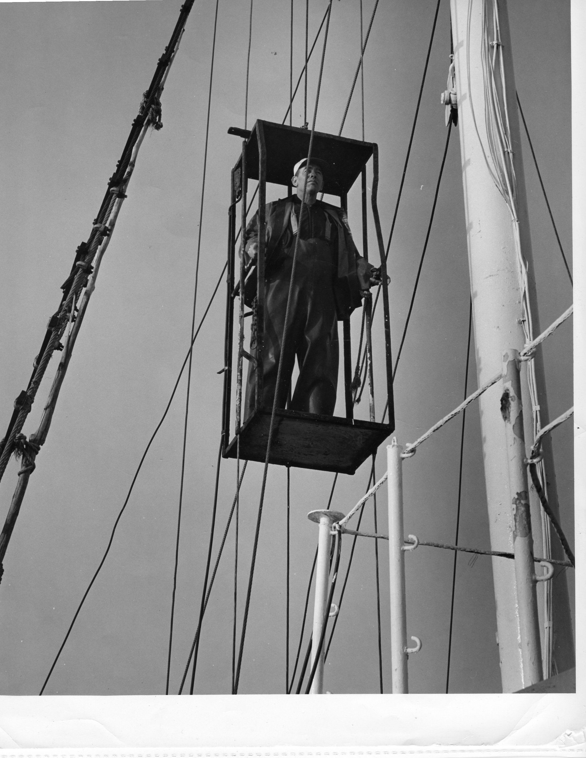 Capt. John Lowry riding the elevator to the crows nest at the top of the mast