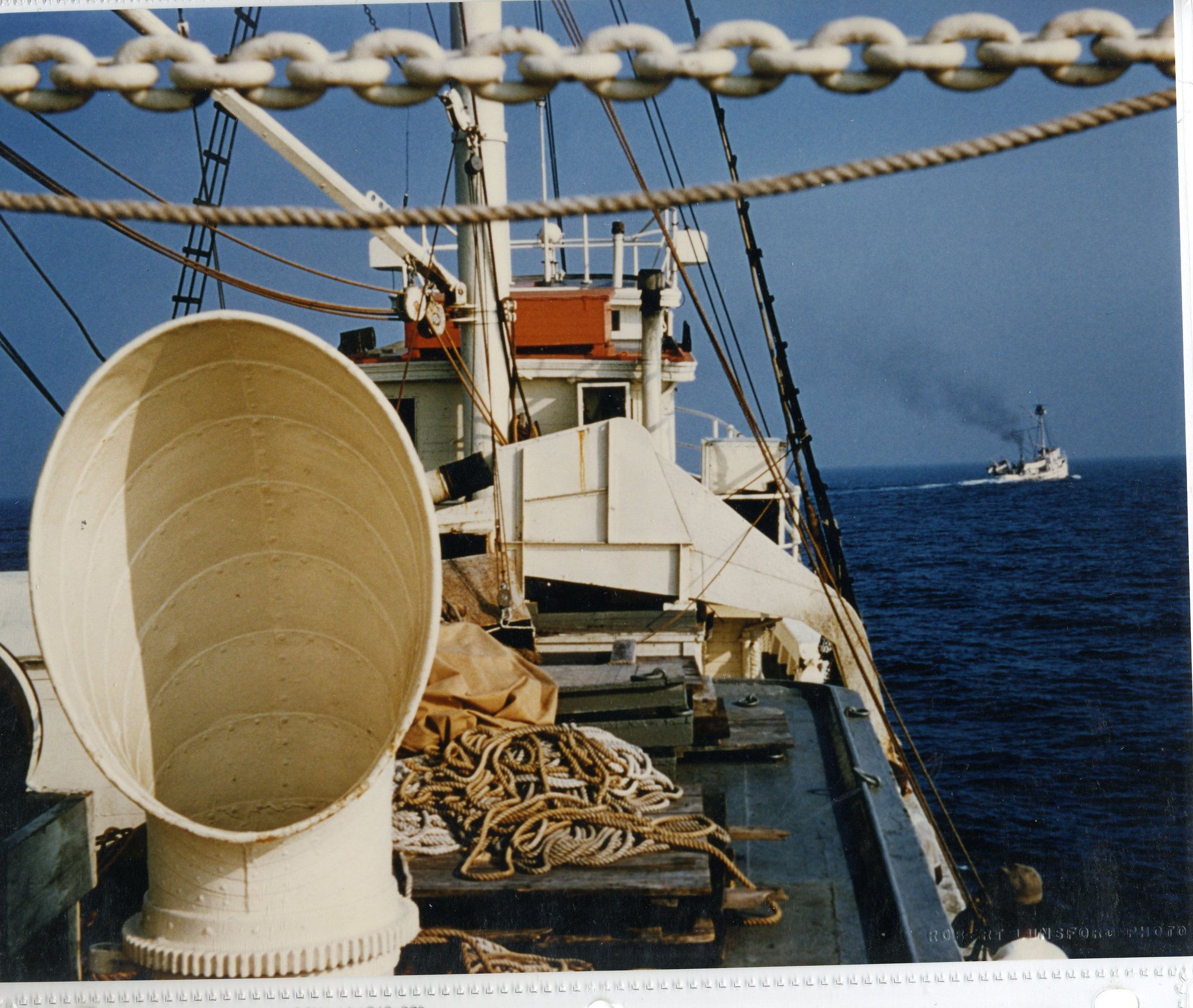 Menhaden vessel Margaret owned by Reedville Oil and Guano Co. aft looking forward at engine room air intake and chain holding davits for purse boatsCollection