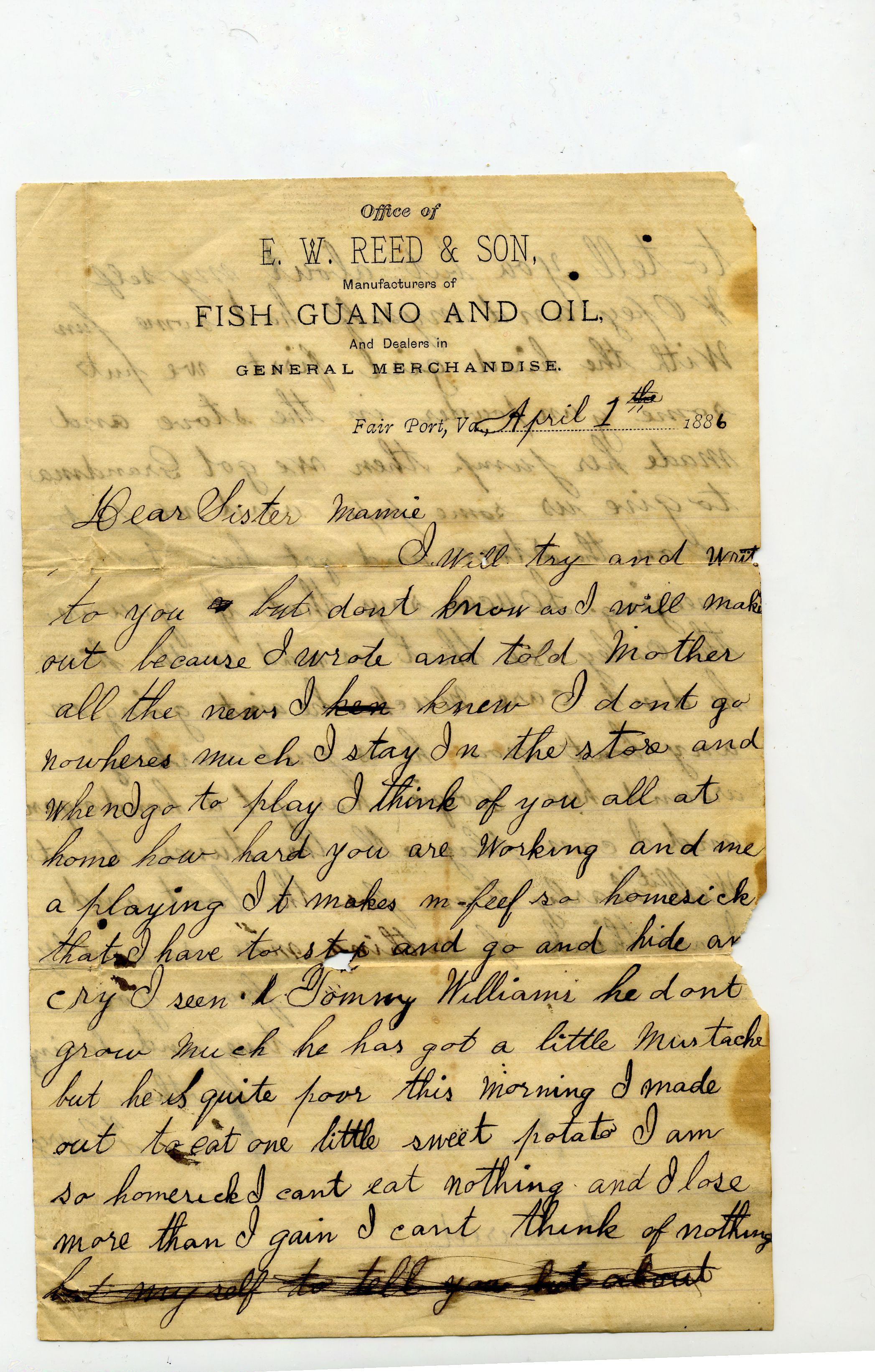 Written on E.W. Reed stationery, from "Henry" to "Sister Mamie"; Henry evidently a clerk in general store in Reedville, but mailed in Fairport because Reedville had no Post Office at that time (PO moved to Reedville in1888).