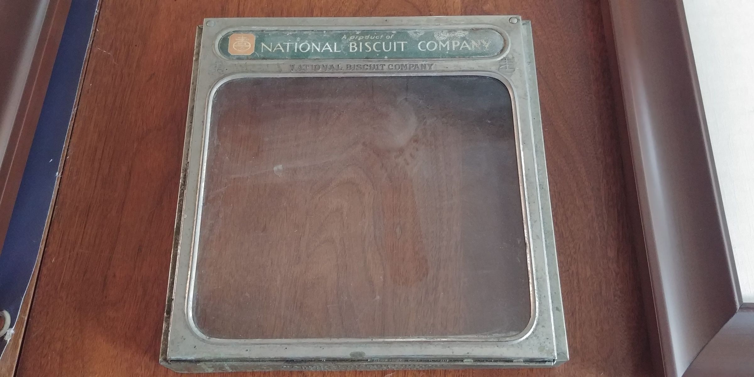 Metal and glass display door for products from the National Biscuit Company. Used in the Bludeun and Hinition store on Main Street in Reedville, Virginia.