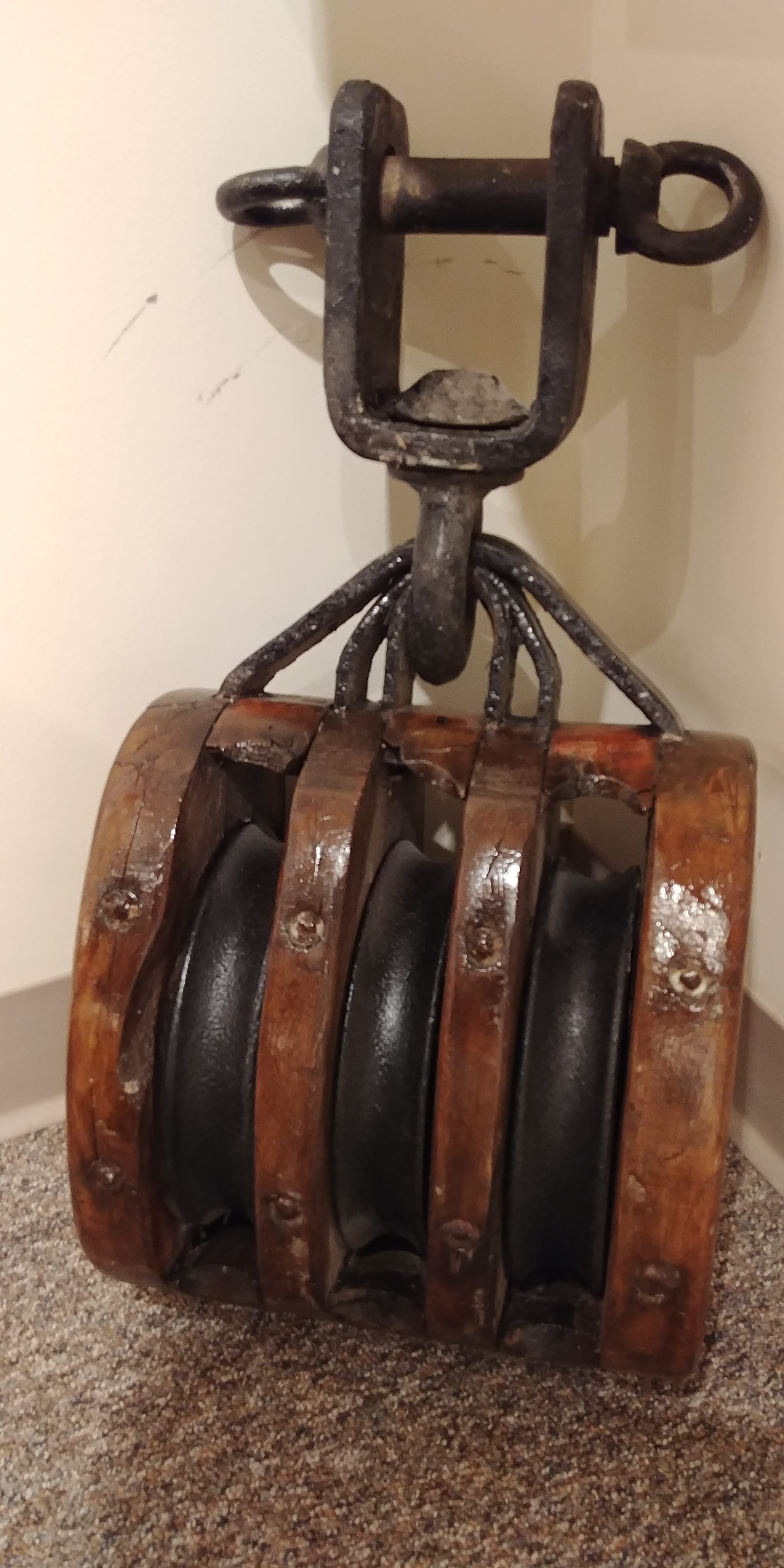 Large, wooden 3-sheave block used for davits