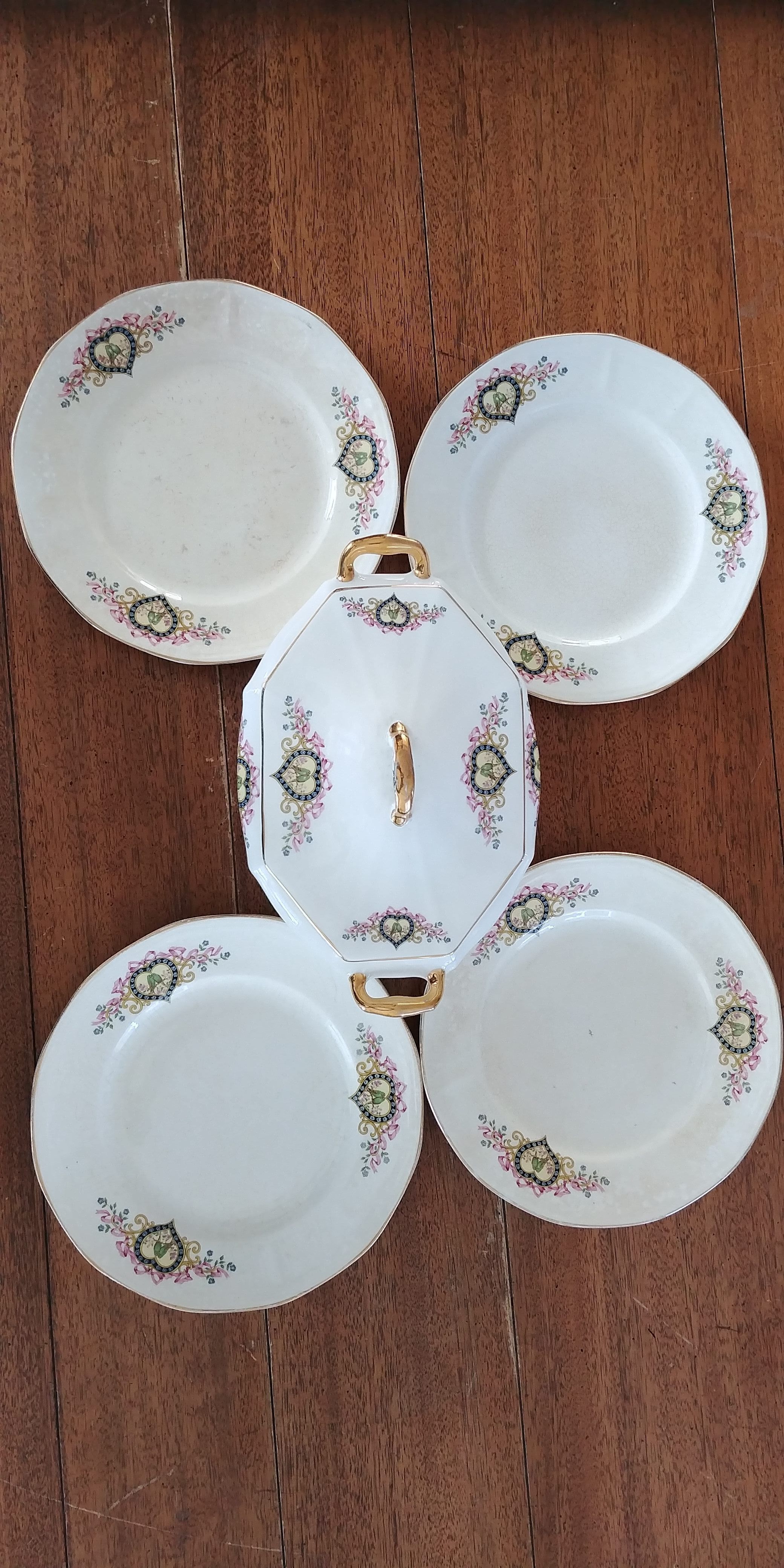 Four Dinner Plates and a Covered Vegetable Dish, "Love Bird" Pattern.