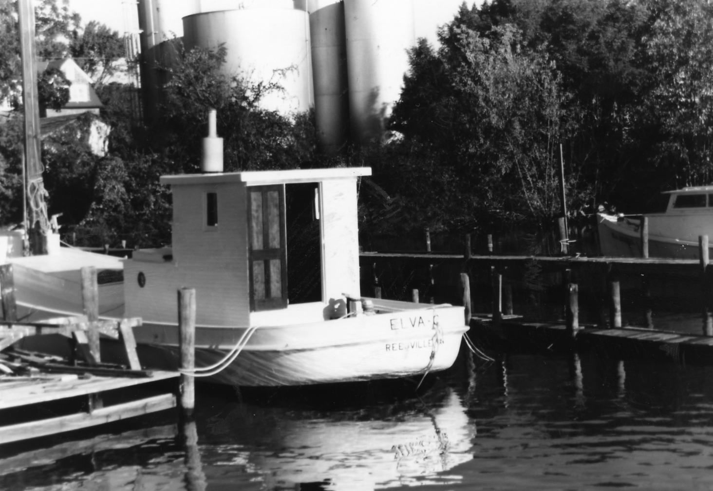 Black and white snapshot of the stern and pilot house of the fishing vessel, Buy Boat and cargo vessel, Elva C at Butler M.R.Collection