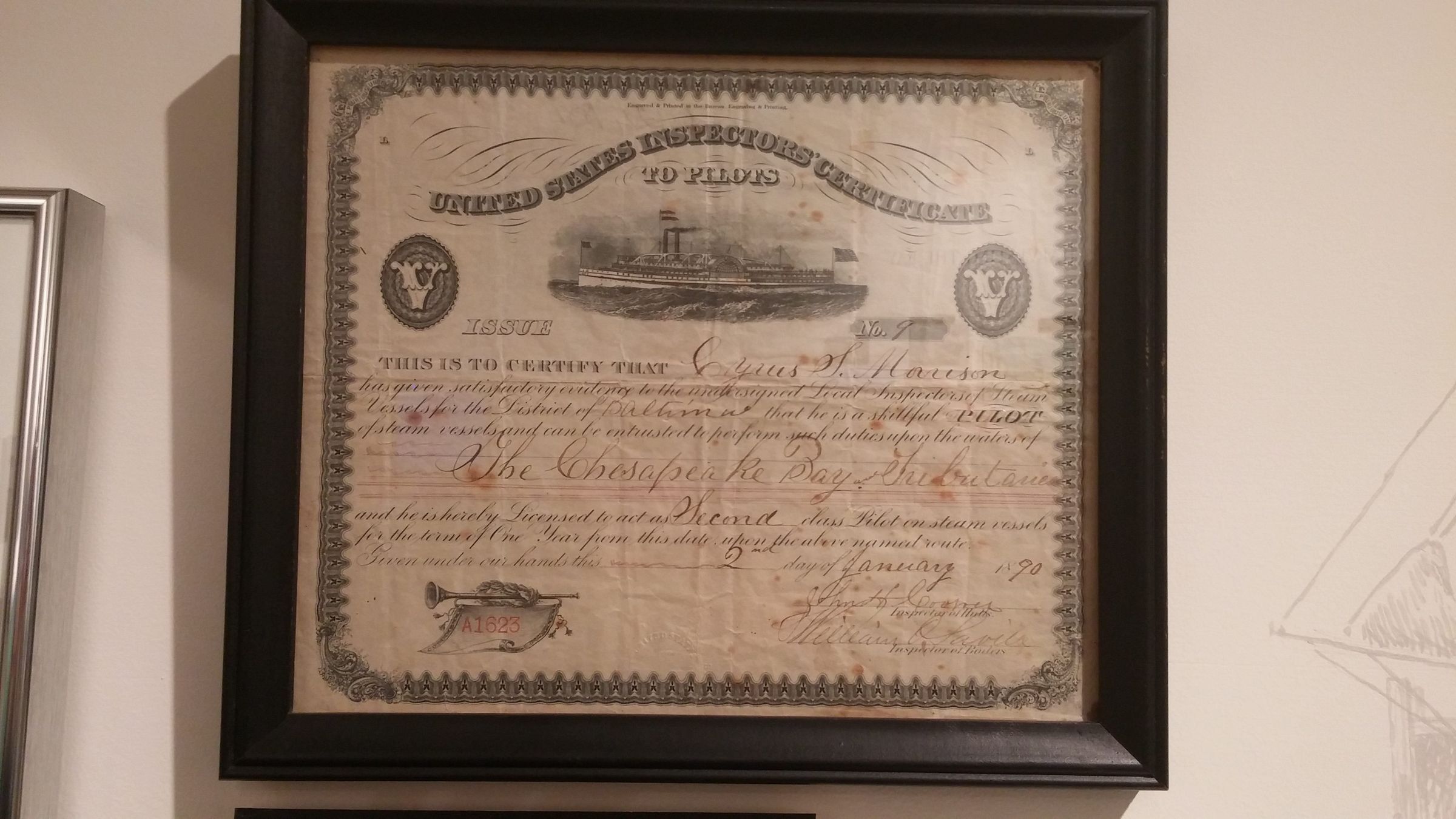 Framed steamship pilot's license, issued to CAPT Cyrus Morrison