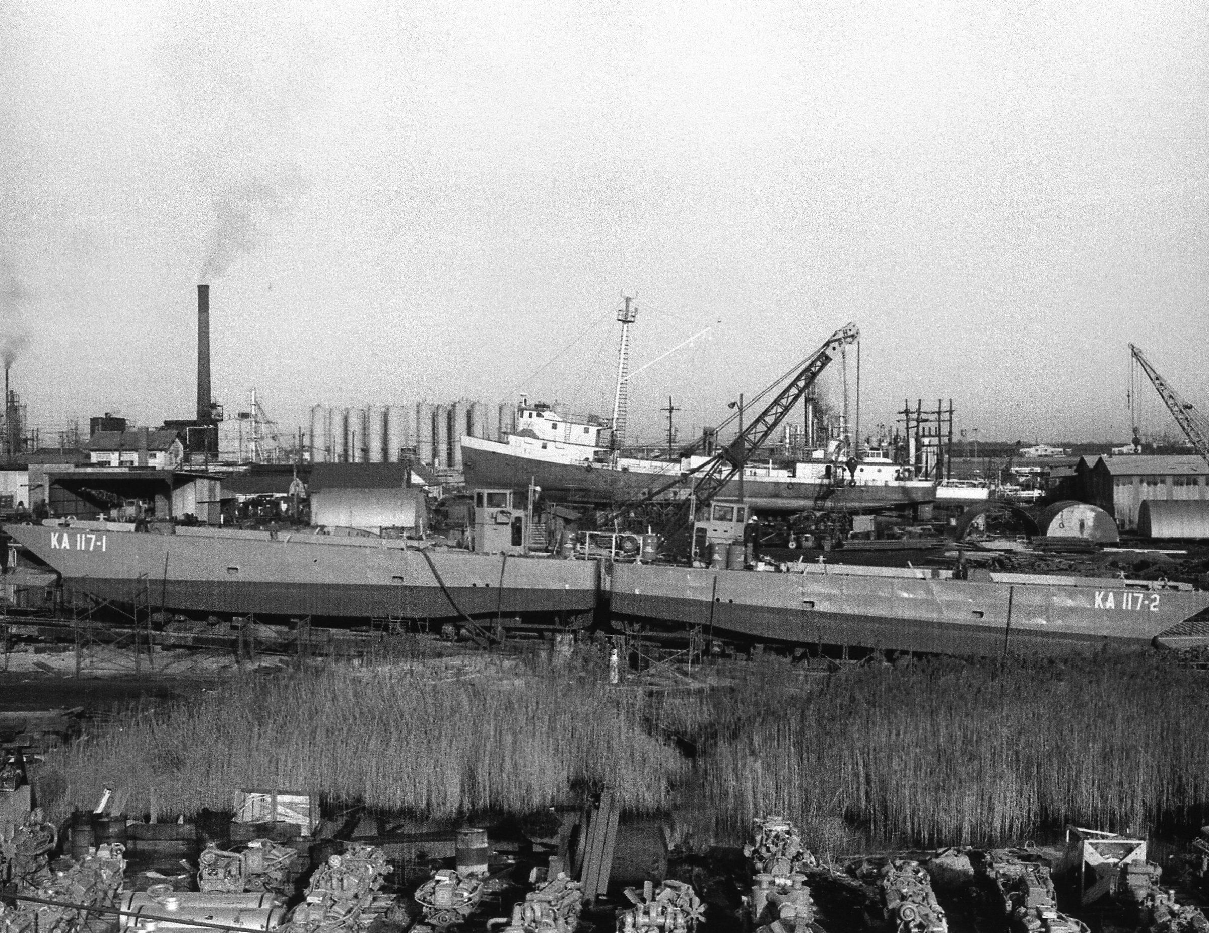 Engines in Norfolk shipyard, Allen W. Haynie in background; perhaps landing barge diesel engines;