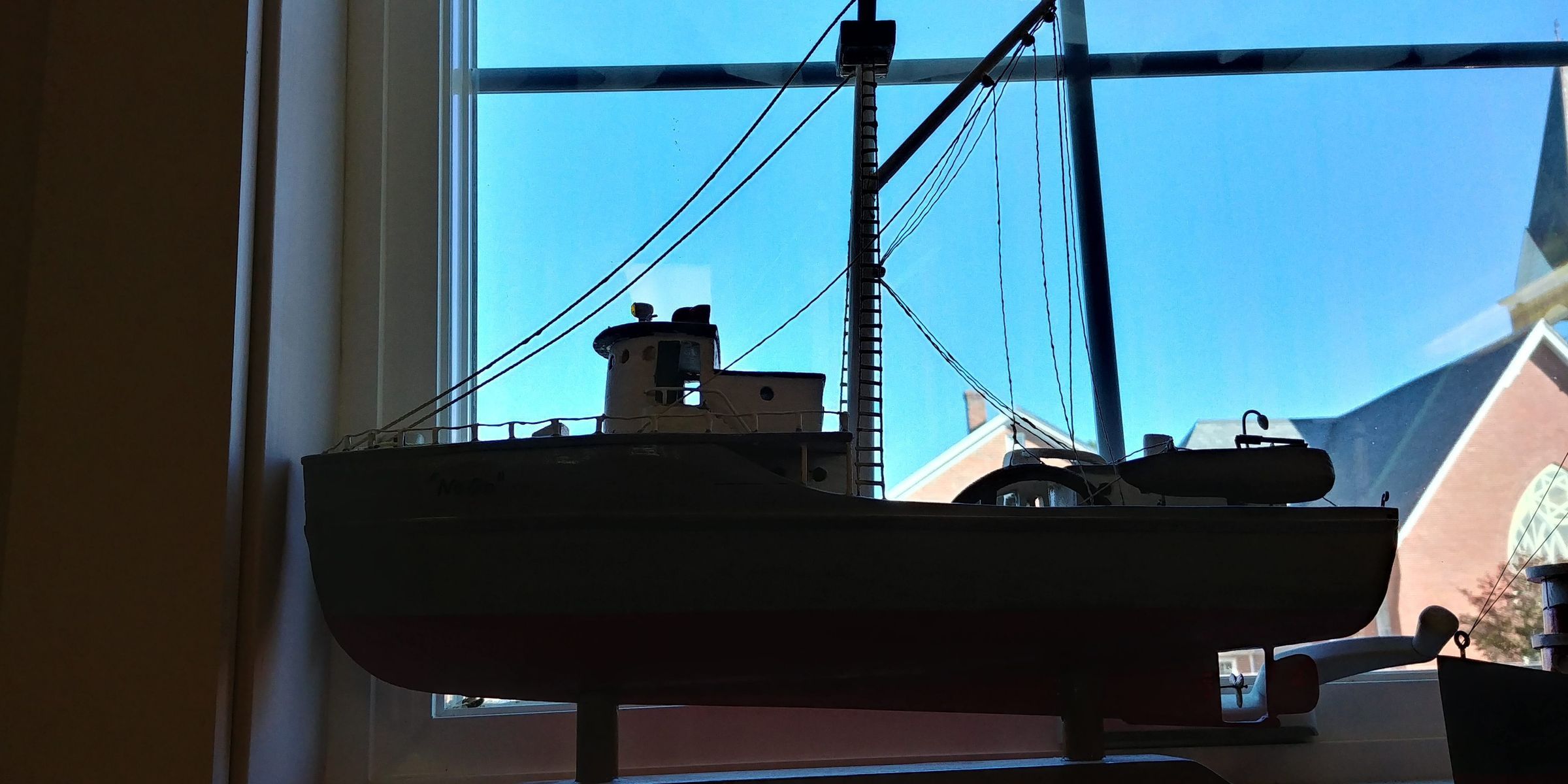 Menhaden Fishing Boat model by Maryus O. Saunders Sr. "NoGo" is a representation of a minesweeper converted to a menhaden fishing vessel. It is carved from balsa wood