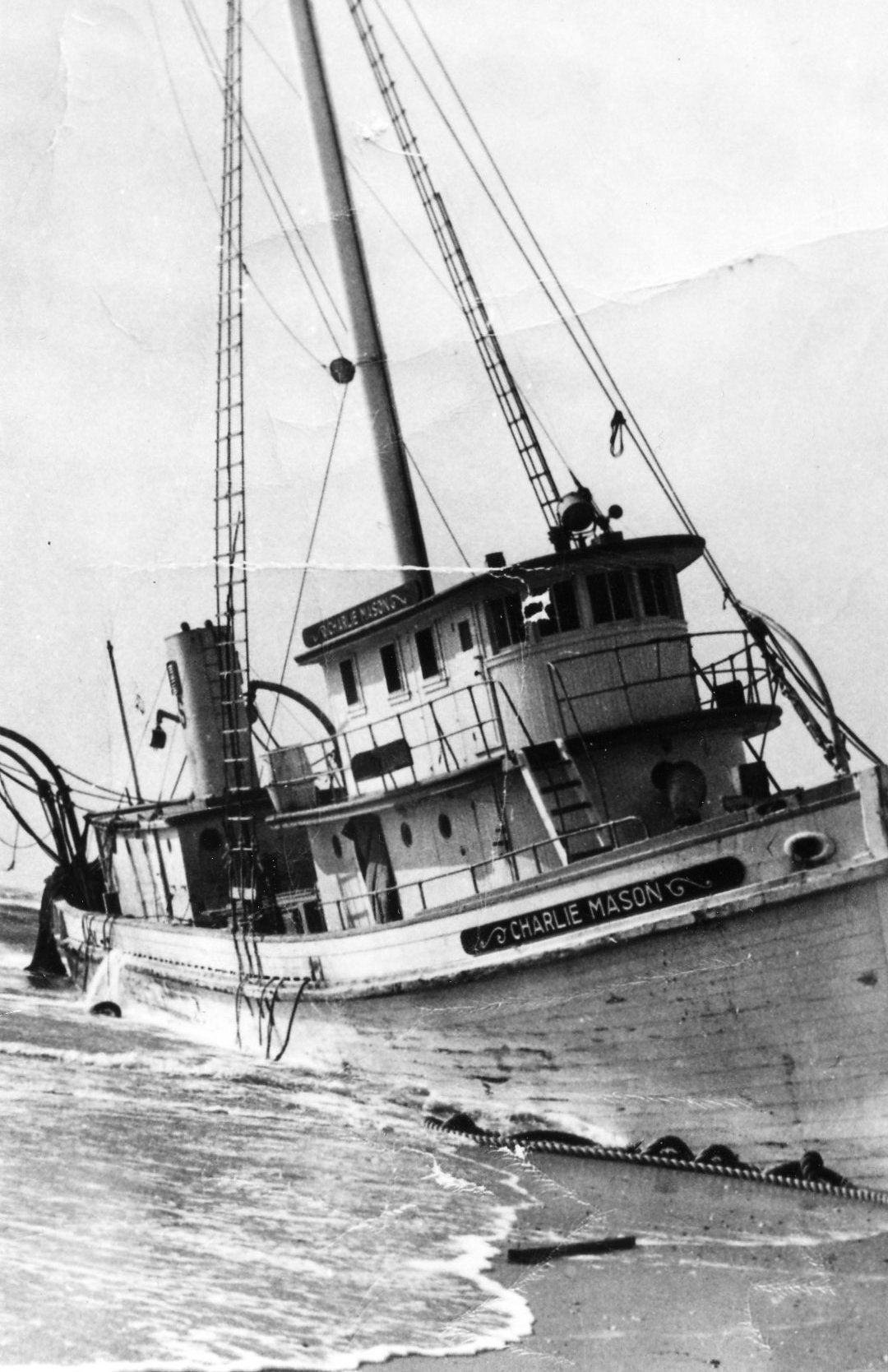 Wooden Menhaden boat "Charlie Mason" grounded on the beach in Okracoke, NC on 1/1/1949