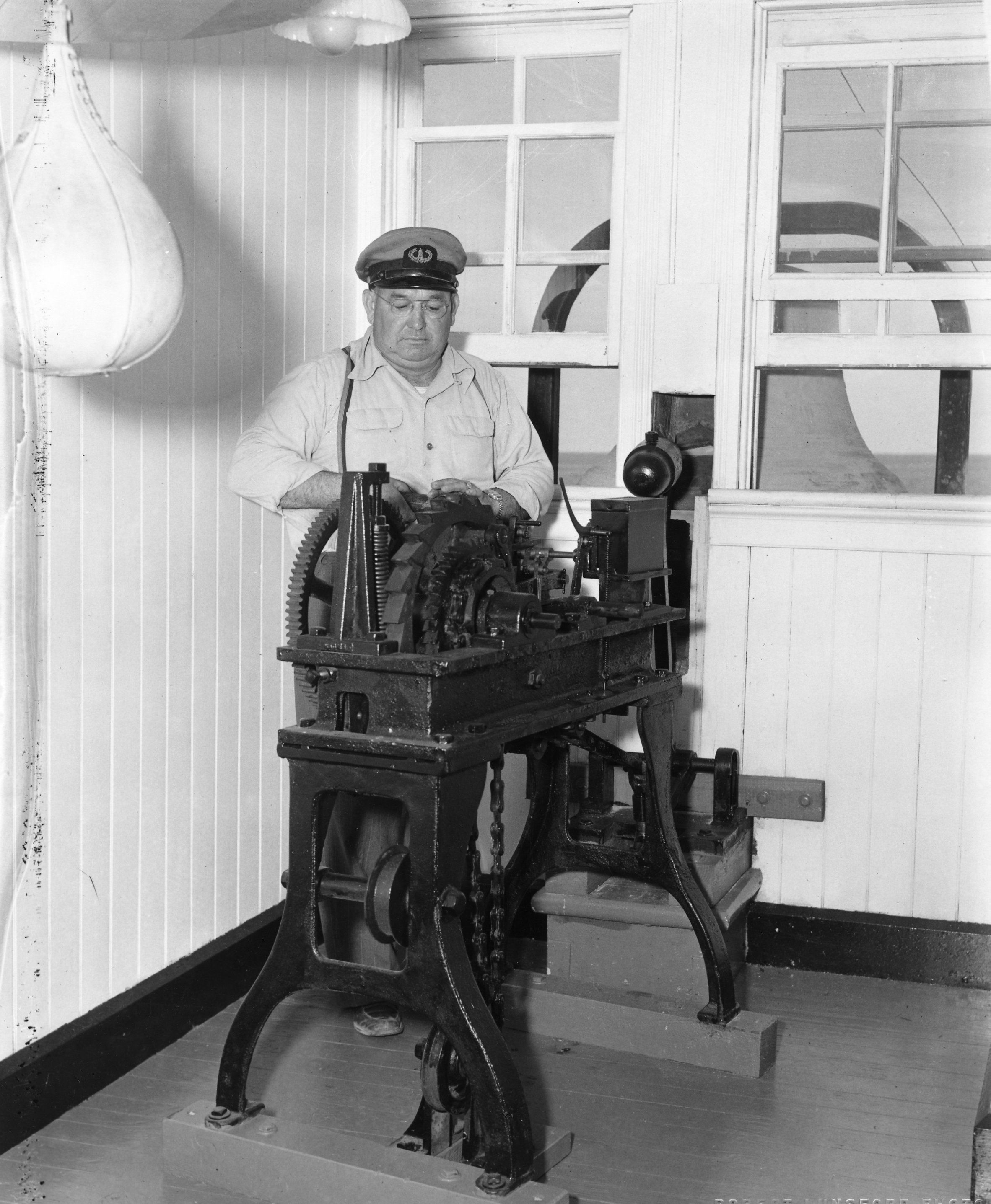 Interior of Wicomico Lighthouse showing civilian attendant adjusting the mechanism that turns the becon of the lighthouseCollection