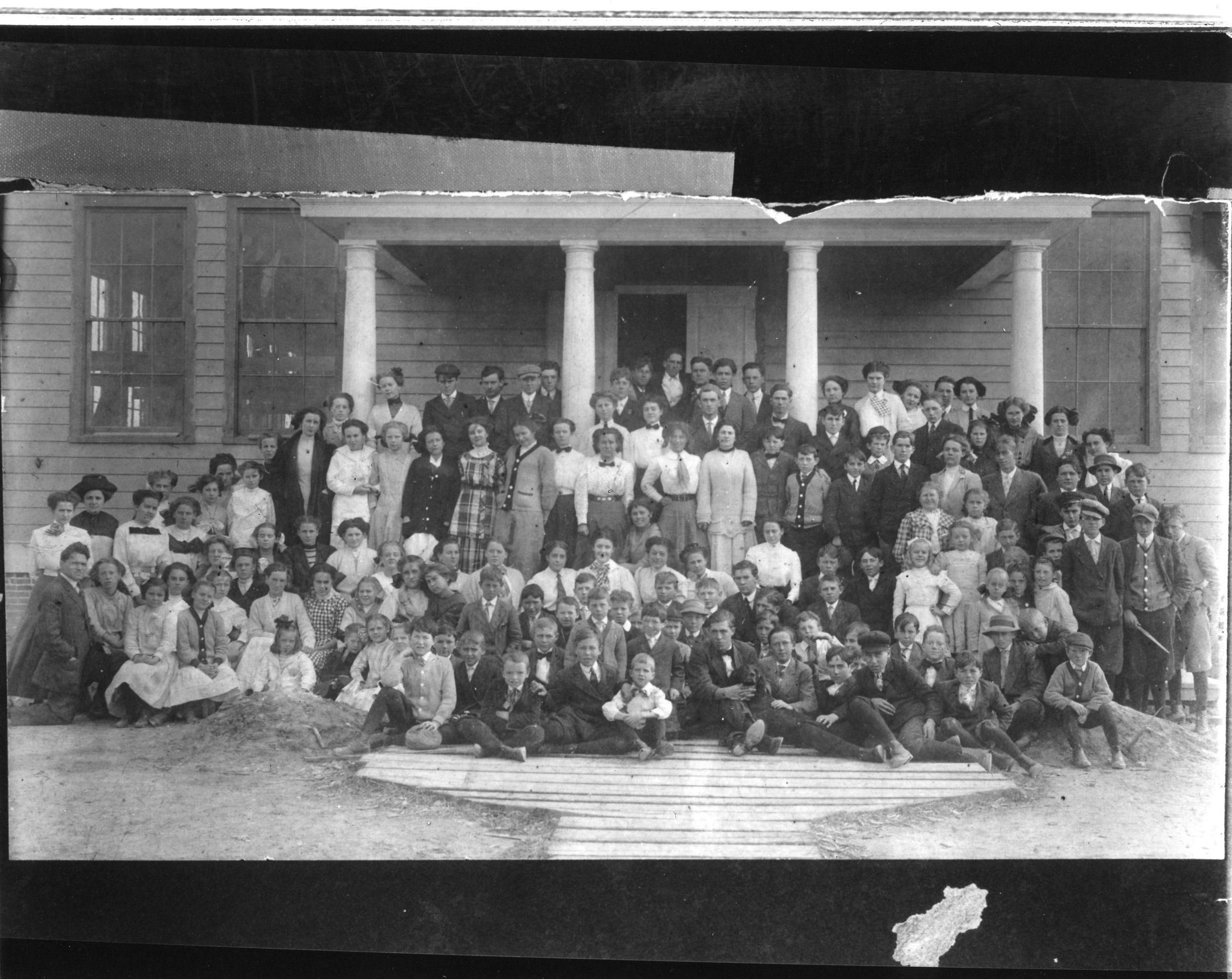 Photo of damaged original photo. Reedville School students and teachers posed in fron of the schoolCollection