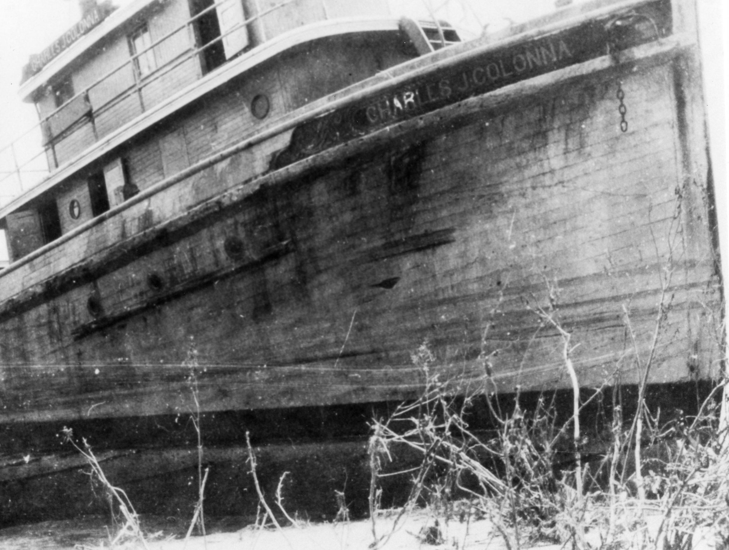 F/V Charles J Colonna ashore at Dameron Marsh August 1933. En route from Baltimore to Reedville when engine failed, anchoir chain failed in teh storm and she was driven ashore. Could walk around her entirely.Collection