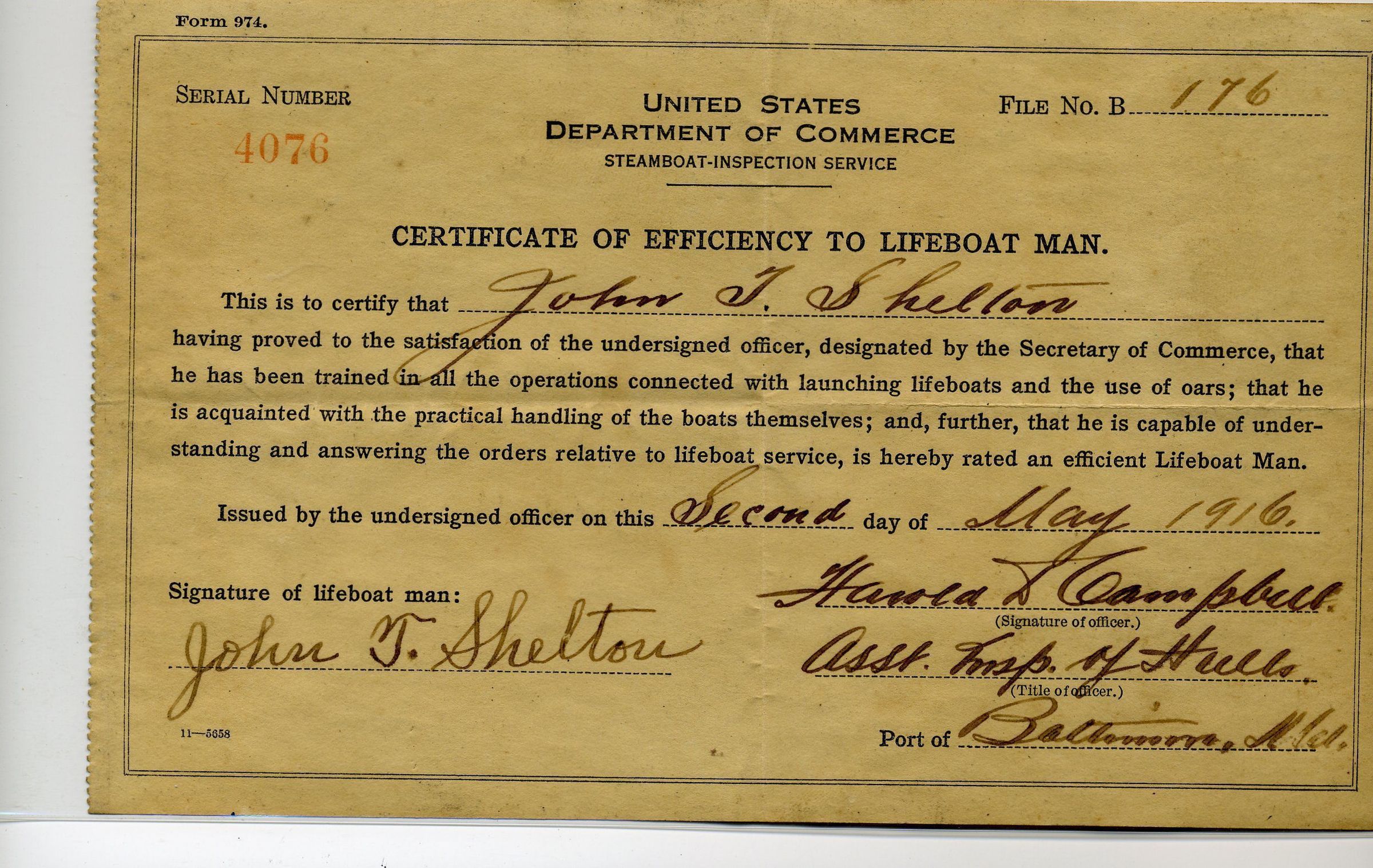 Lifeboat certificate for John Shelton, 1916
