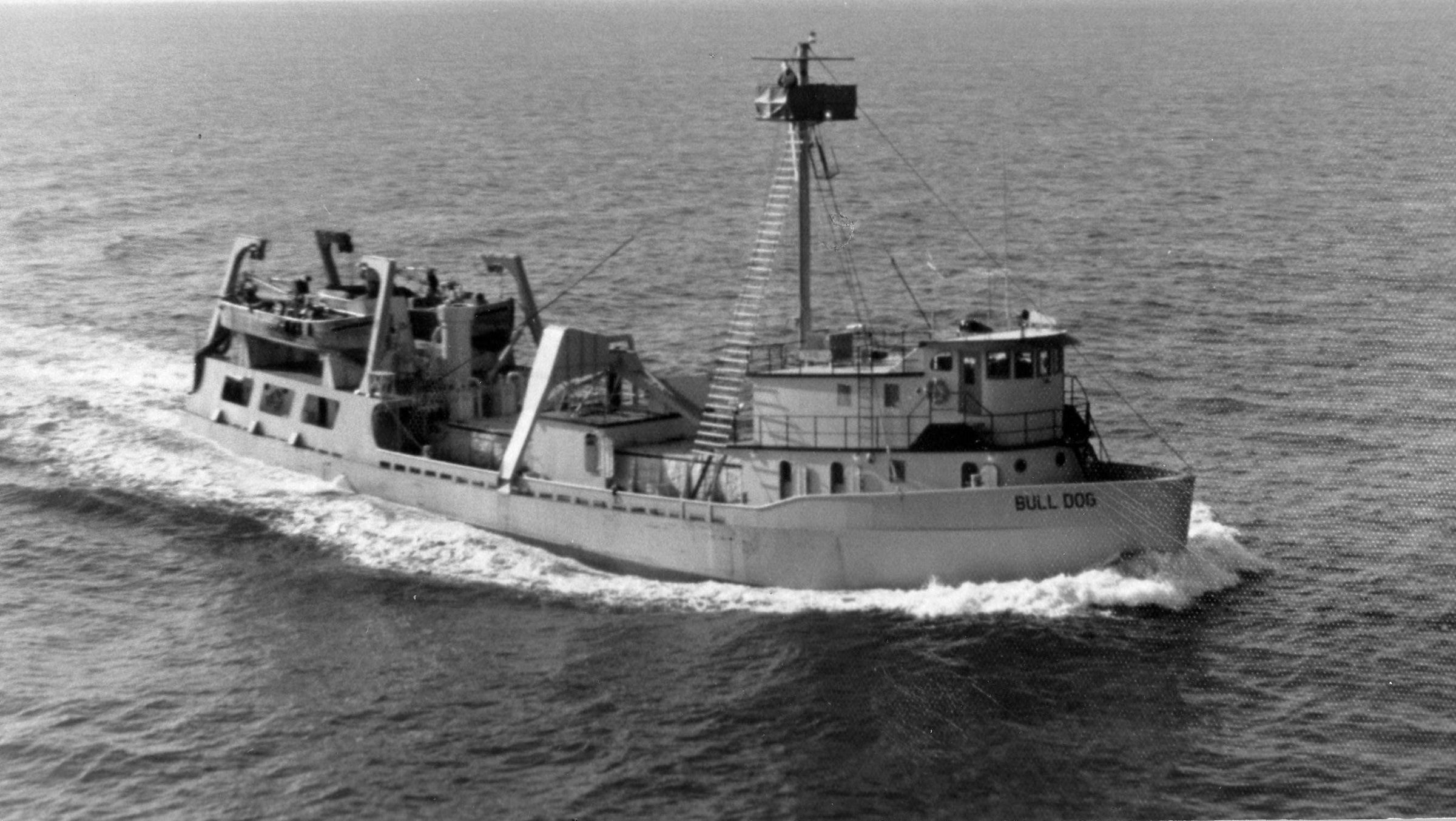 F/V "Bulldog"; CAPT Charles Lee Forrest in Gulf of Mexico; Black and white Built in 1977 in Mermentau LA one of the last purpose built menhaden fishing boats. Fished for Zapata Haynie in the Gulf and in the Chesapeake Bay. CAPT Forrest caught over one billion Menhaden during his career. He was awarded command of the Bulldog as a result of his record catches.Collection