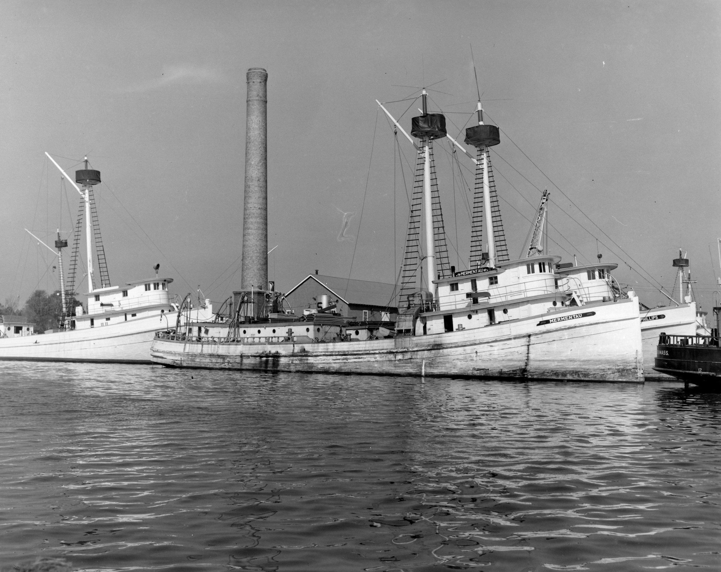 Menhaden fishing vessel Mermentau and Mattie Phillips at Reedville Repair facility Menhaden Products In c including Morris Fisher tall stackCollection