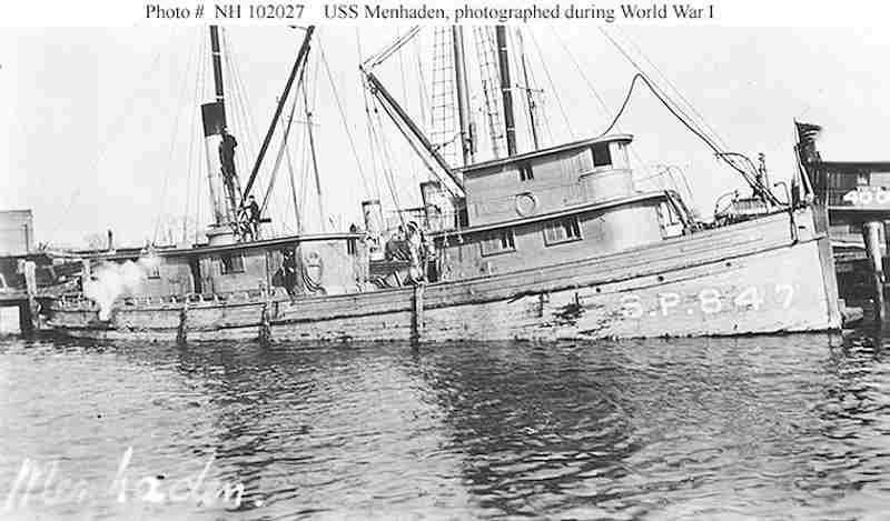 Menhaden fishing vessel 'Menhaden' built in Pocomoke City MD for E. Benson Dennis fish co. out of Cape Charles VA. Chartered from owner by US Navy 1917 assigned to Hampton Roads area as a tug. Later owned by Southport Fish Scrap and Oil Co Wilmington NCCollection