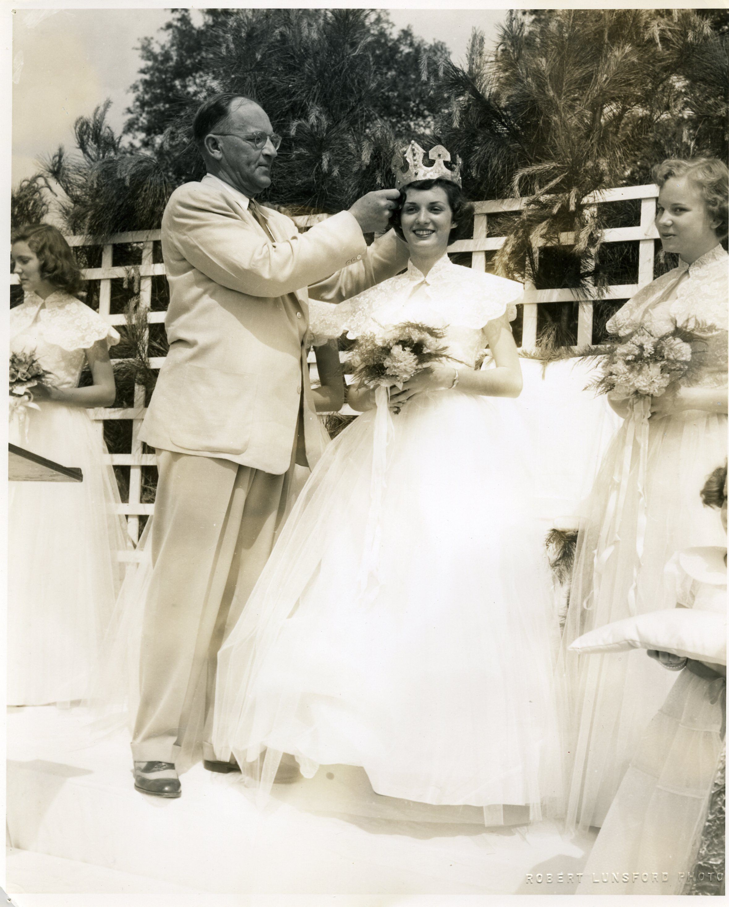 Anne Winters Davis (Bride of Wendell Gayle Haynie) and attendant Faye Rice Pittman. Coronation ceremonry as May Queen by Ammon Dunton Sr.Collection