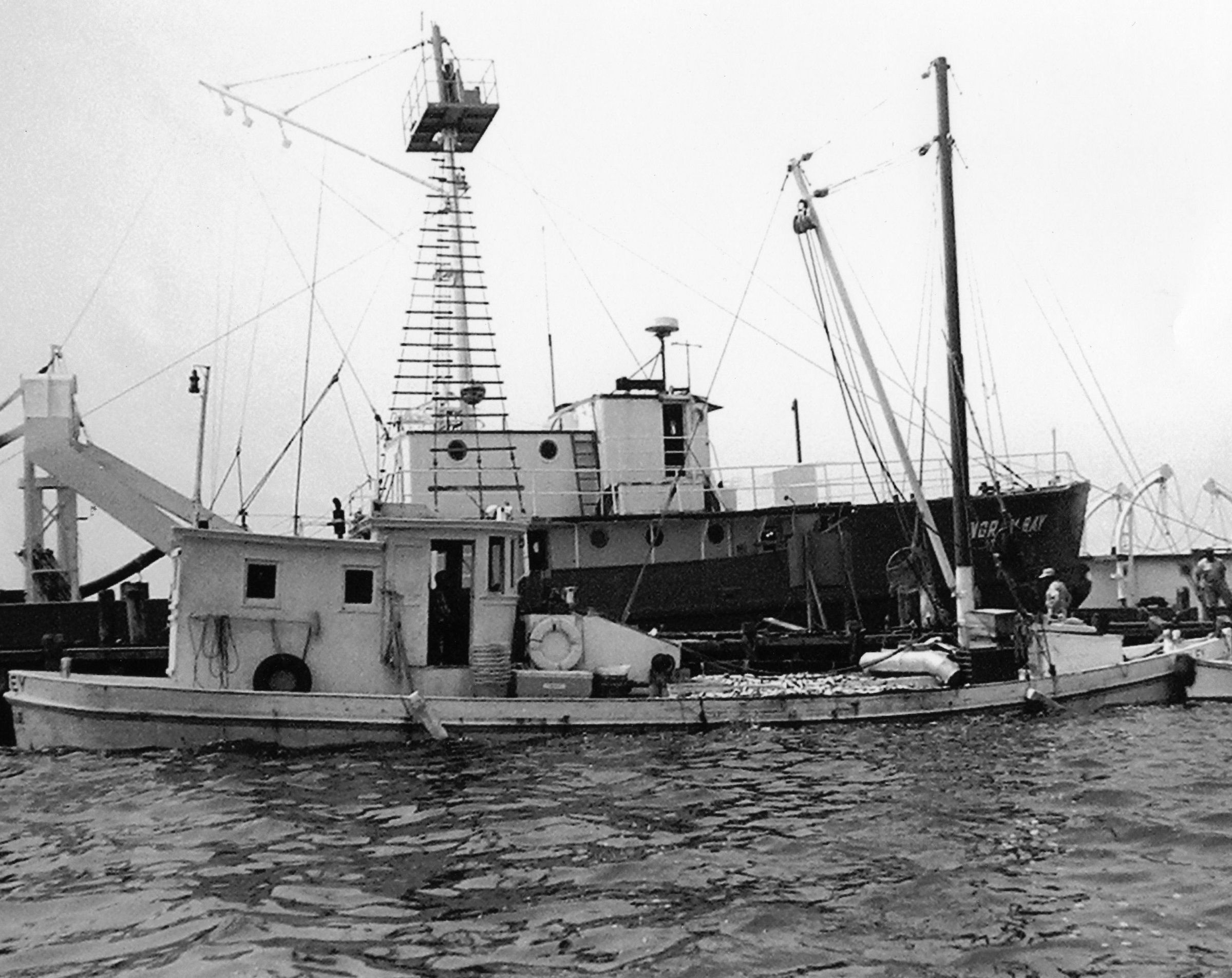 Dudley loaded with herring alongside Ingram Bay menhaden fishing vessel