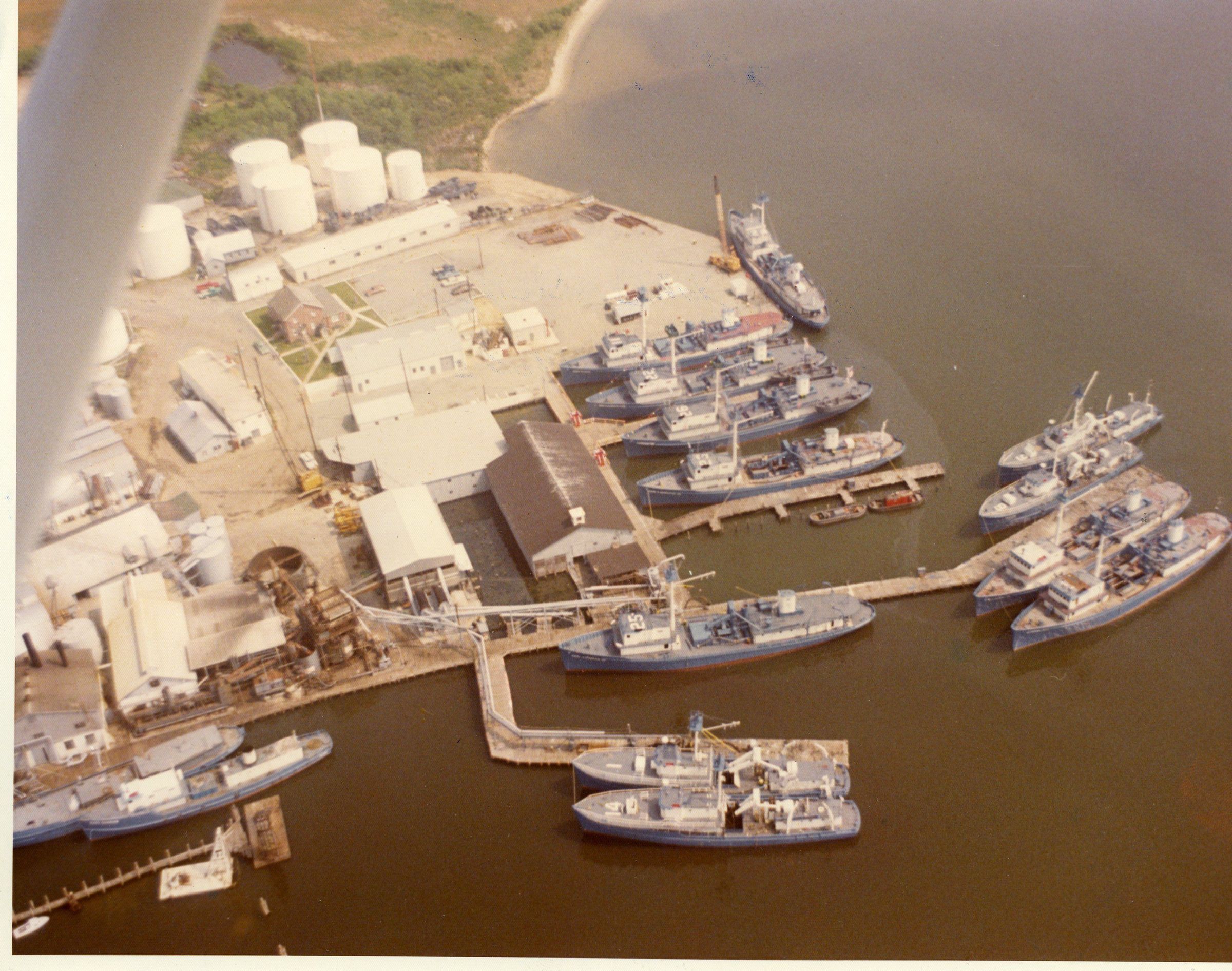 Overhead view of Zapata Haynie showing converted mine sweepers and F.S. boats. view of factory and fishing vesselsCollection