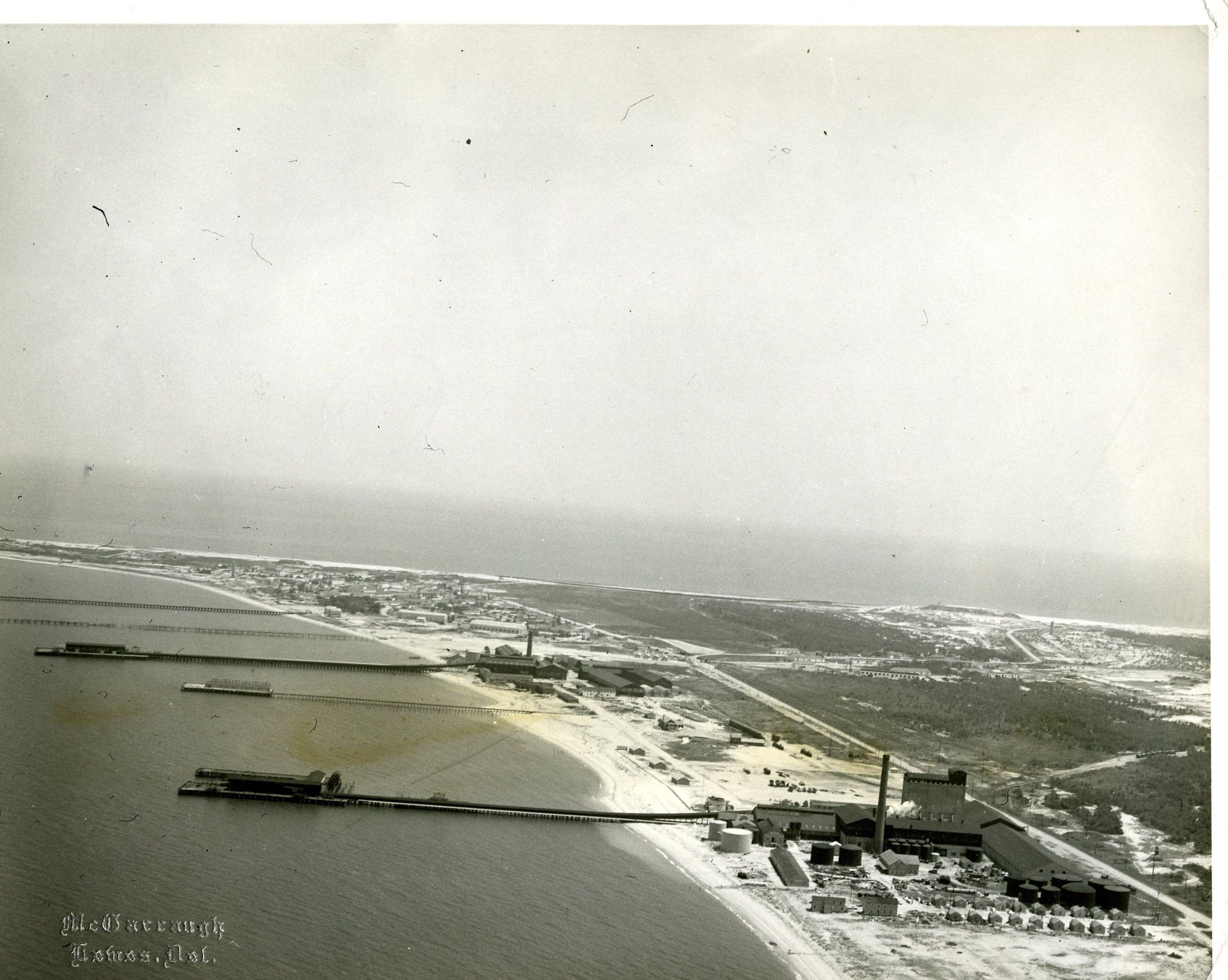 overhead view of Lewes De showing Menhaden Products Co. and Consolidated Fisheries factories