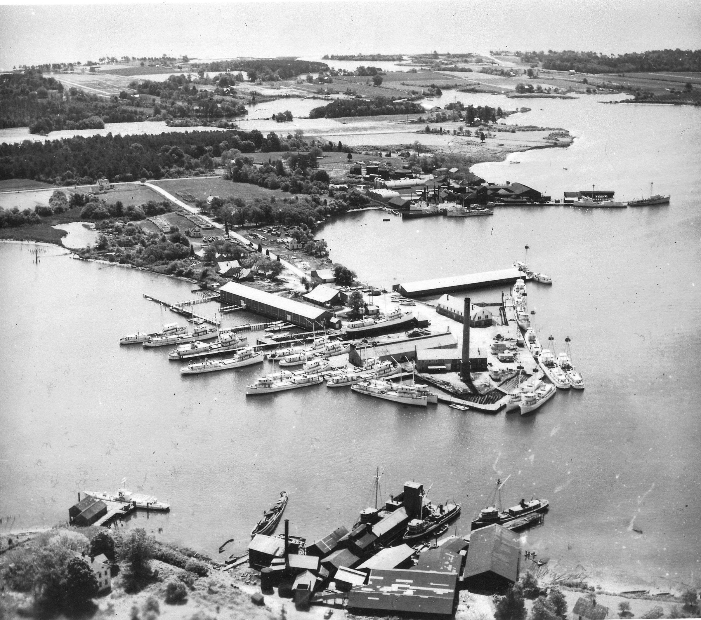 Aerial view of Menhaden Products repair yard (Old Morris Fisher plant), Reedville; 4 photos, variously cropped c. 1948