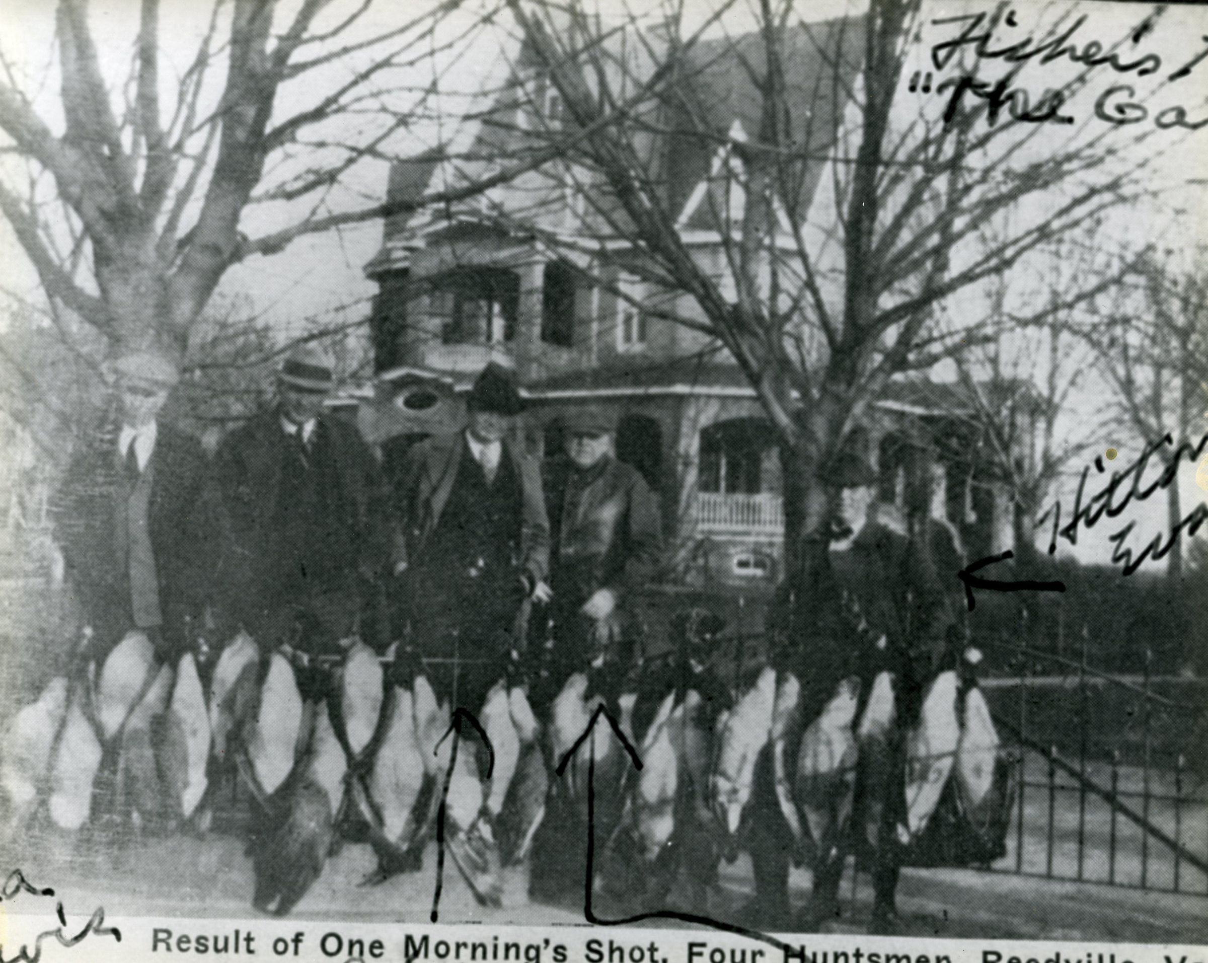 Local gentlemen home from hunting geese in front of the Gables, Reedville. From left: Ira Lewis, T.C. Slaughter, Robert B. Moore, Capt. James C. Fisher, Hilton C. EvansCollection