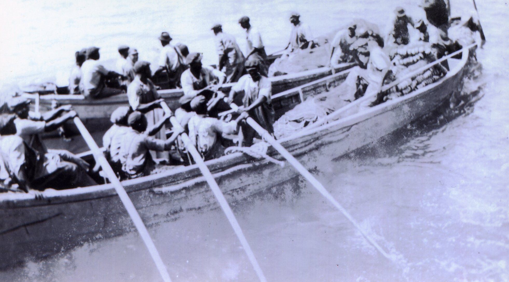two purse boats lashed together showing men rowing in preparation to making a set