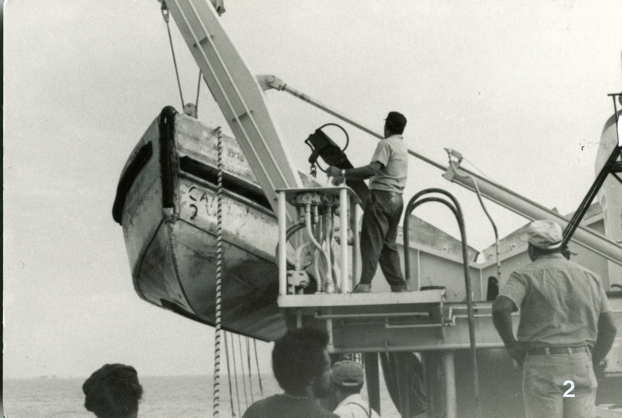 J. Forrest at controls of fishing vessel "Bulldog" and Purse boat in 1977