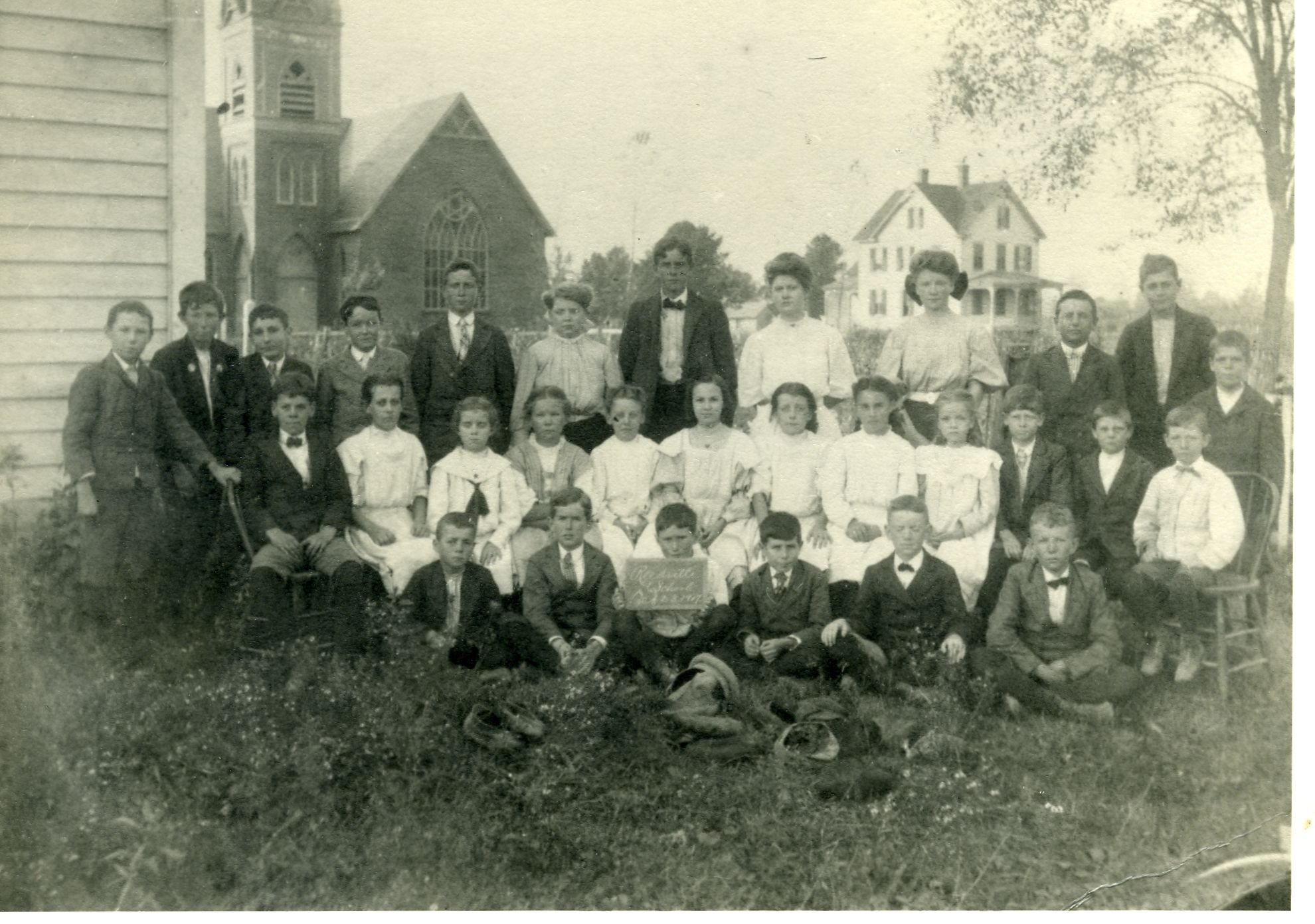 Old photo of Reedville School students, noted on back Miss Mary Alice Harrell was the teacher. In background is Bethany UMC and house next door, which was bulldozed as it had become dilapidated.It is the site of the Gazebo and Playground now.Collection