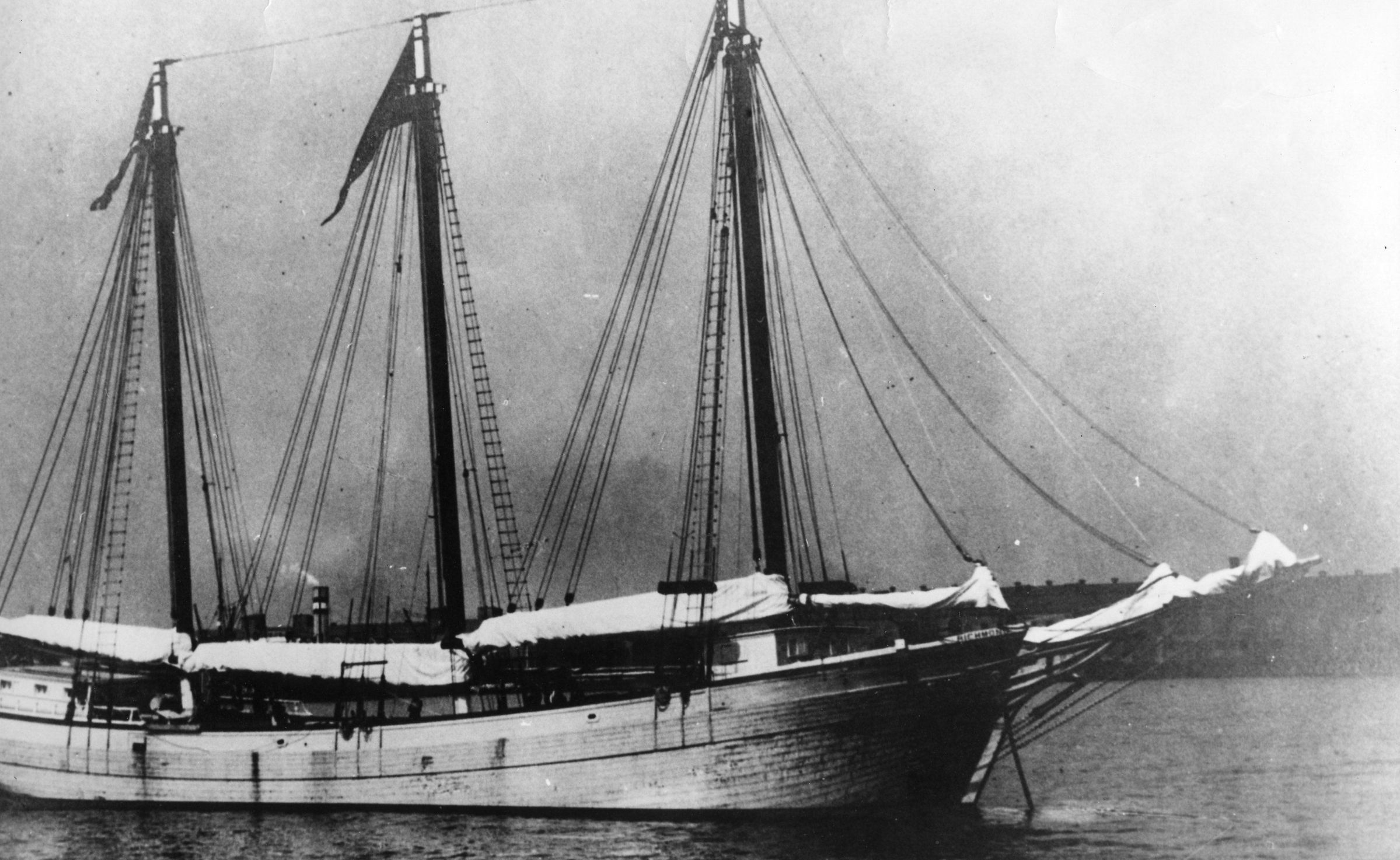 Photo of the "Richmond" in Baltimore Harbor. Built in early 1900's, this is a sailing schooner known as a ram. A vessel of three equal height masts, with a narrow beam to navigate the Chesapeake and Delaware canals. Carried fish meal to Baltimore and returned with coal. Boat owned by Capt. Thomas W. Haynie of Reedville.