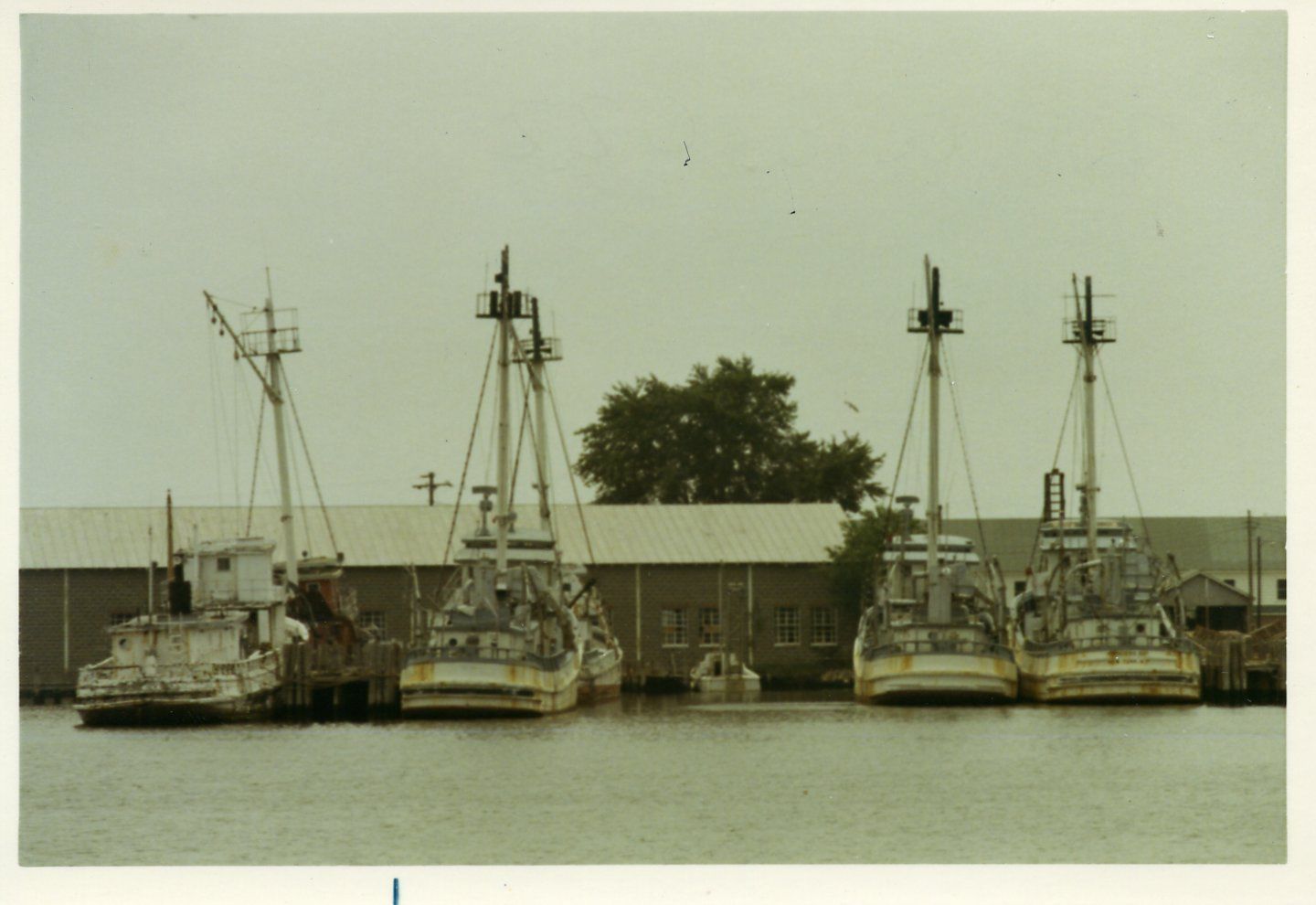 Five wooden menhaden boats tied at the Menhaden Products Co