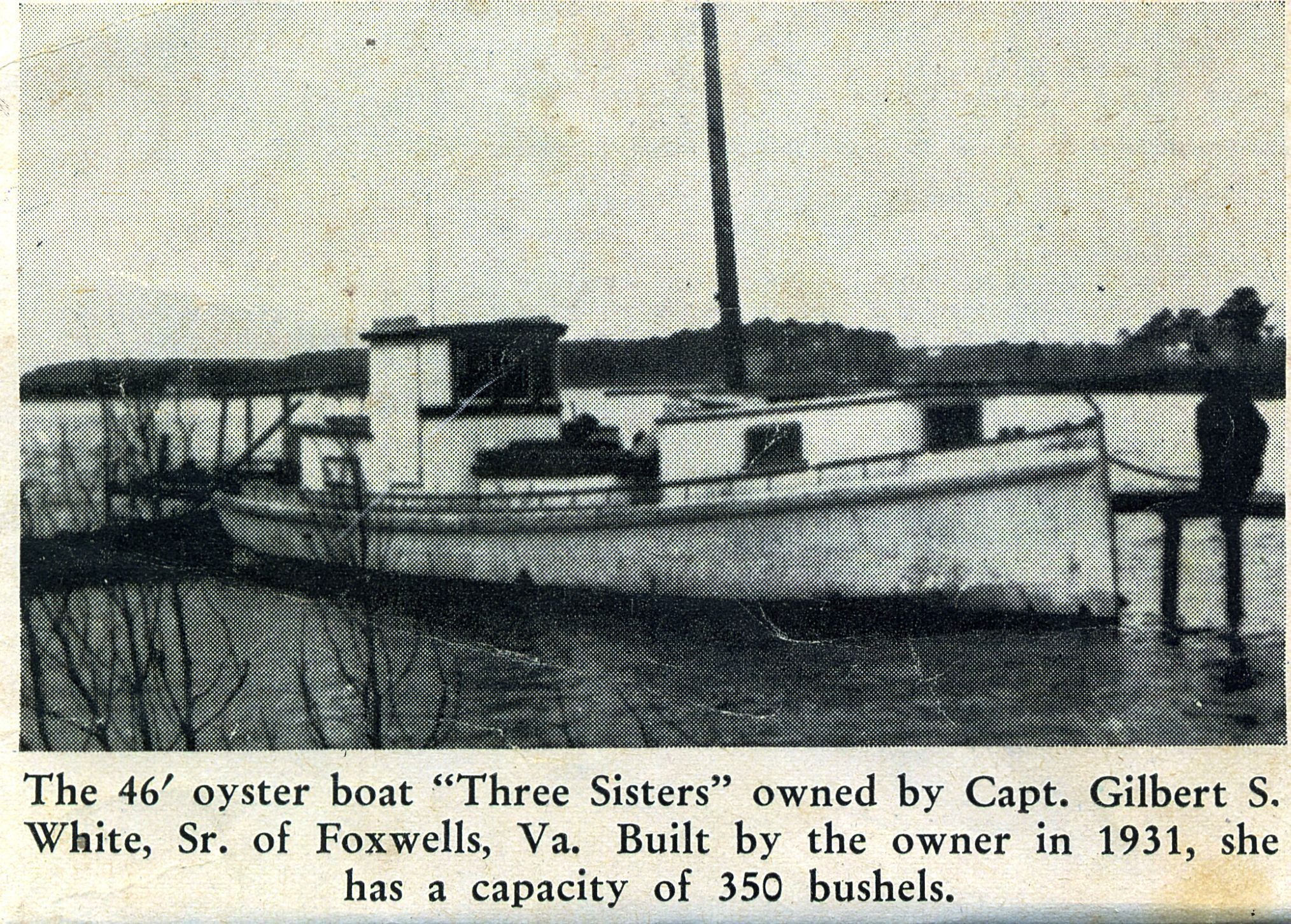46' oyster deck boat Three Sisters built and owned by Capt. Gilbert S. White, Sr. of Foxwells. built in 1931 capacity of 350 bushels. Named for his three daughters, Viola, Sadie and Ella JoCollection