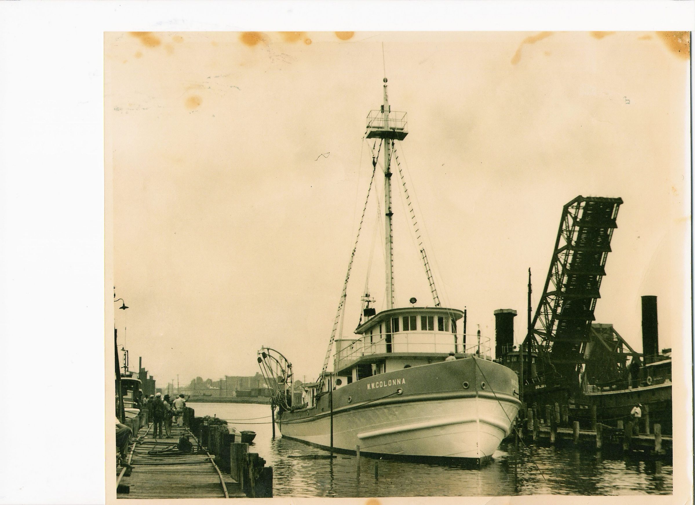 The "W. W. Colonna" was built in 1911 by Newport News Shipbuilding as a freighter the "Carolina" Later owned by Ben and Will Colonna Co. and fished as Atlantic Fishing Co primarily selling their fish to Reedville Oil and Guano Co. Reedville. Boat was later sold to Zapata Haynie who took her to Moss Point MS for refitting with power block technology. Explosion and sunk in port killing 2 workersCollection