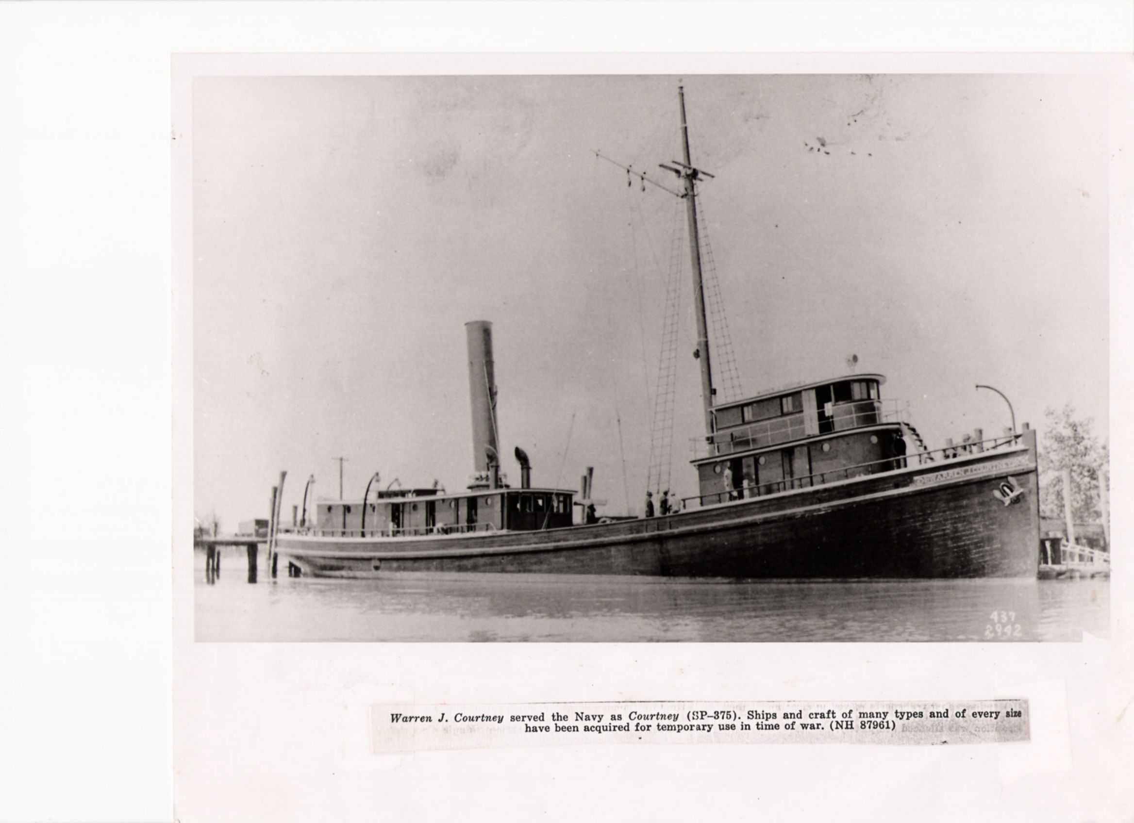 The "Warren J. Courtney" was bult in 1912 in Wilmington, DE, for C.E. Davis Packing Co., Fairport, VA. She was served in WWI as a mine sweeper (Courtney SP 375), rigged for foreign service and assigned patrol duty in Breest, France.