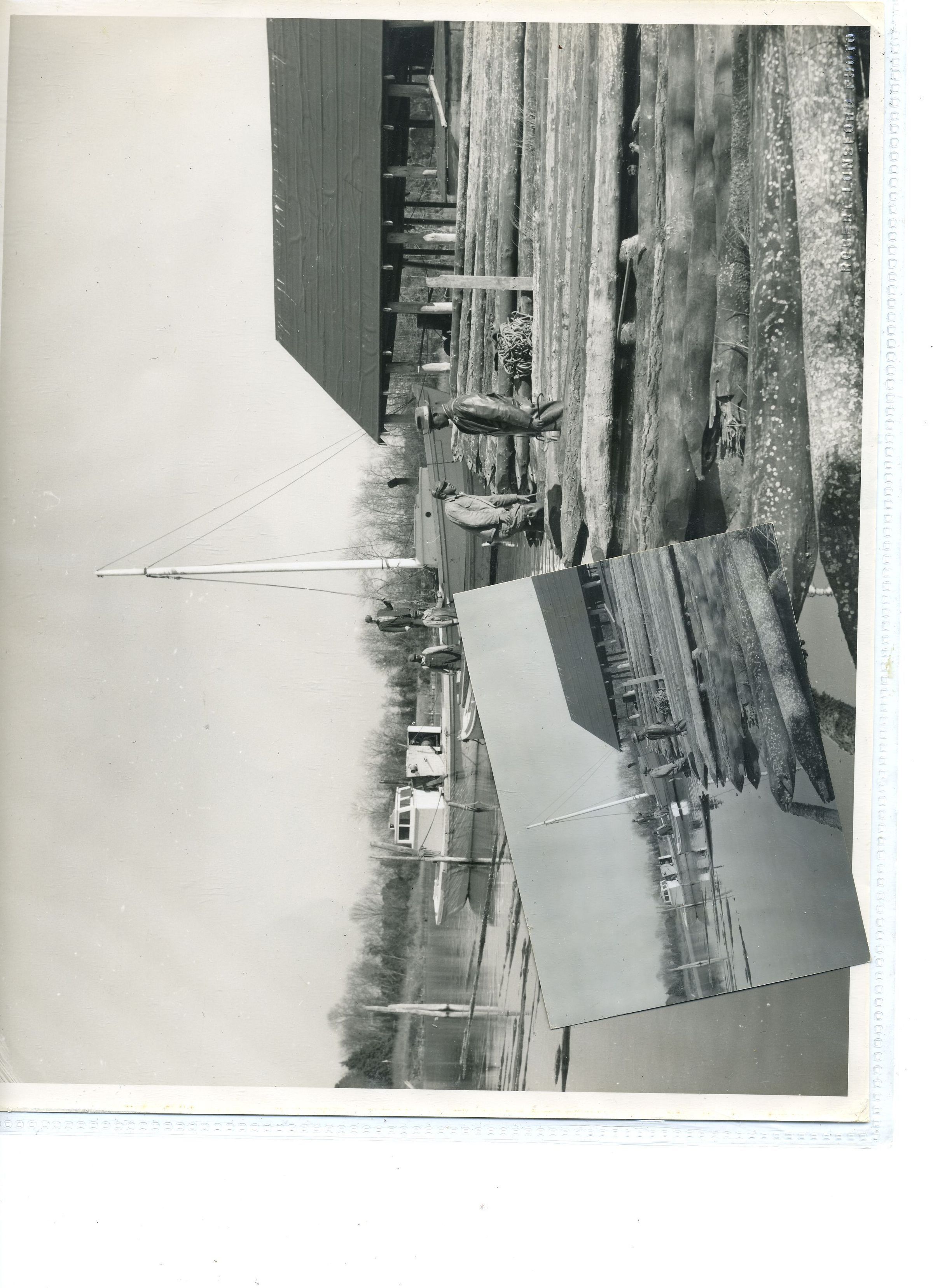 Trap poles being sharpened and cleaned prior to setting out in the spring. Waterman Leonard Balderson and trap boat Robert LeoCollection