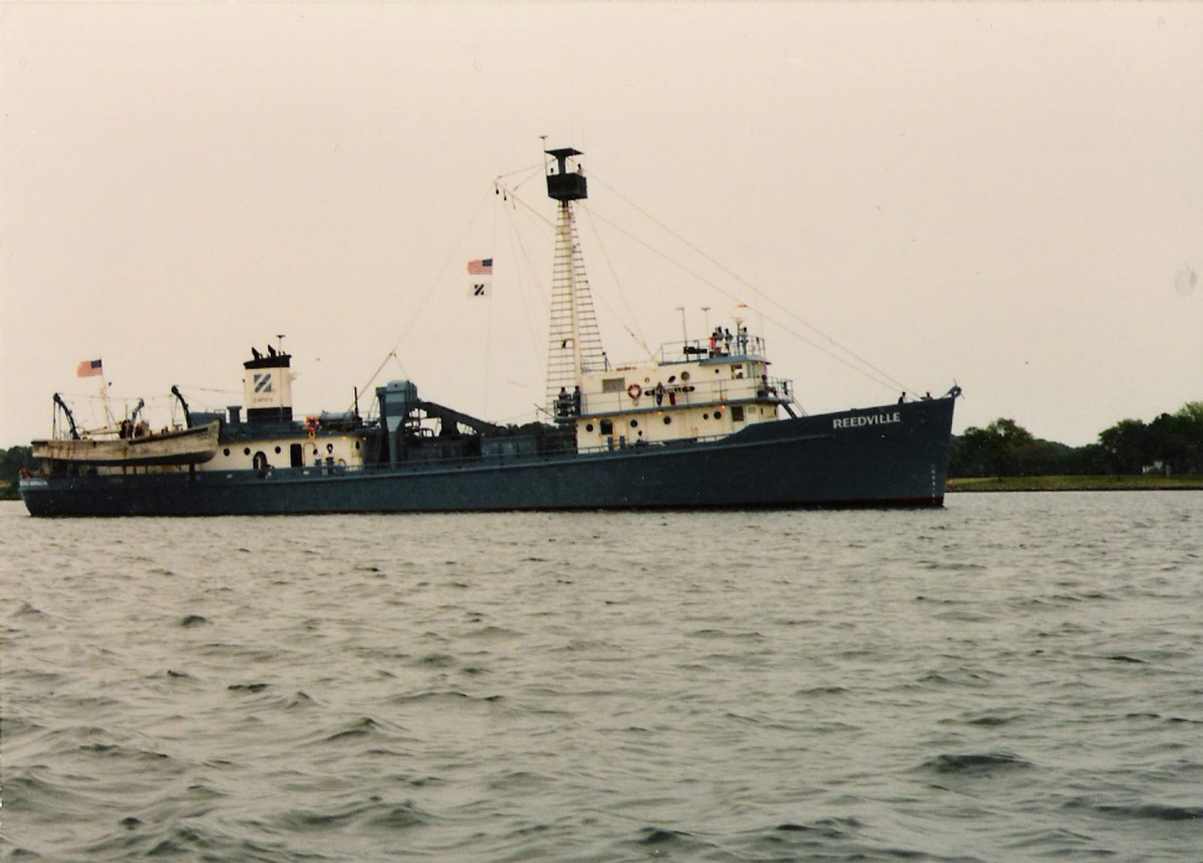 The "Reedville" was built for the US Army as an FS 278 (freight service) vessel, in Long Island, NY, in 1944. She was used to supply bases in the Pacific, the bought by the Navy in 1960 and converted to a range instrumentation ship. She worked out of Point Magu, CA, then Little Creek, VA, and finally off Virginia coasts.