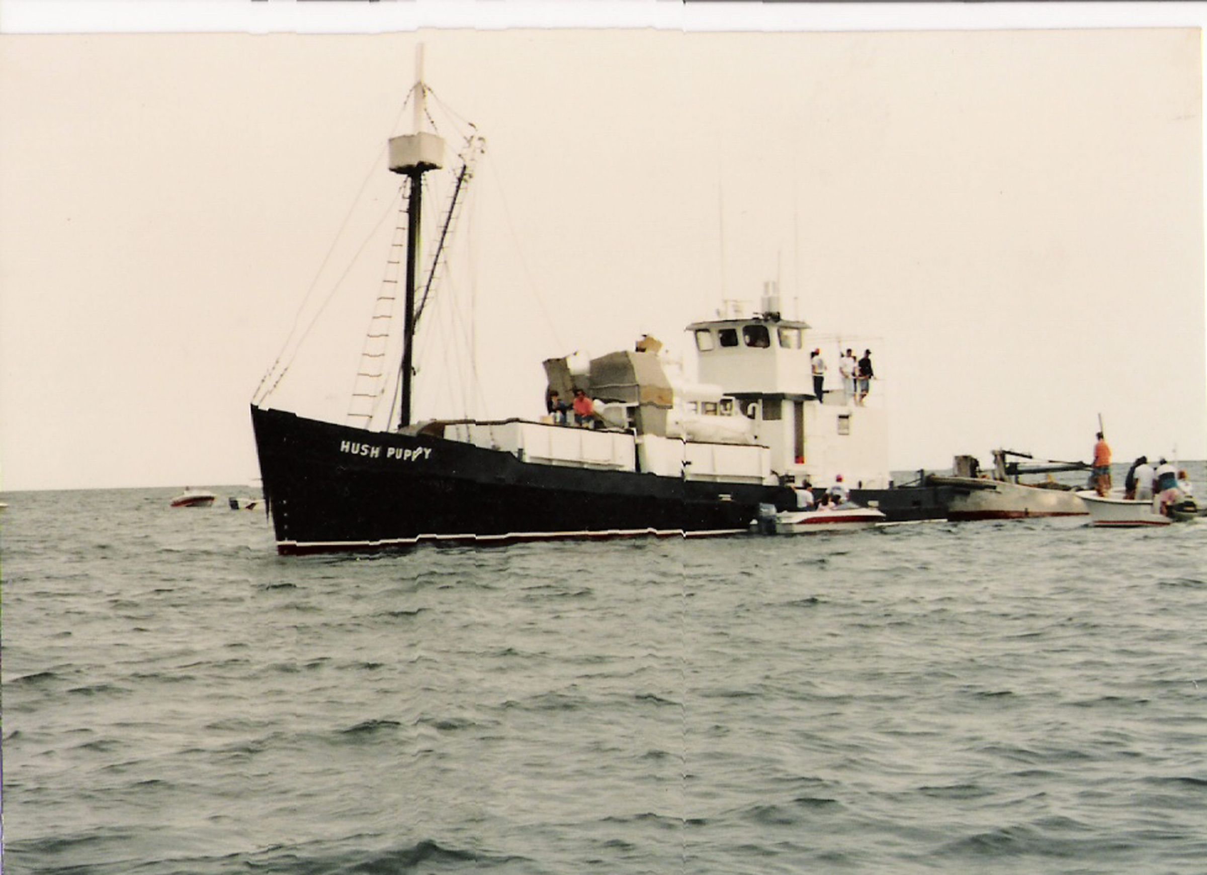 The "Hush Puppy," a small shallow draft, steel-hulled boat, desisgned for snapper rig menhaden fishing shallow water of Pimlico Sound