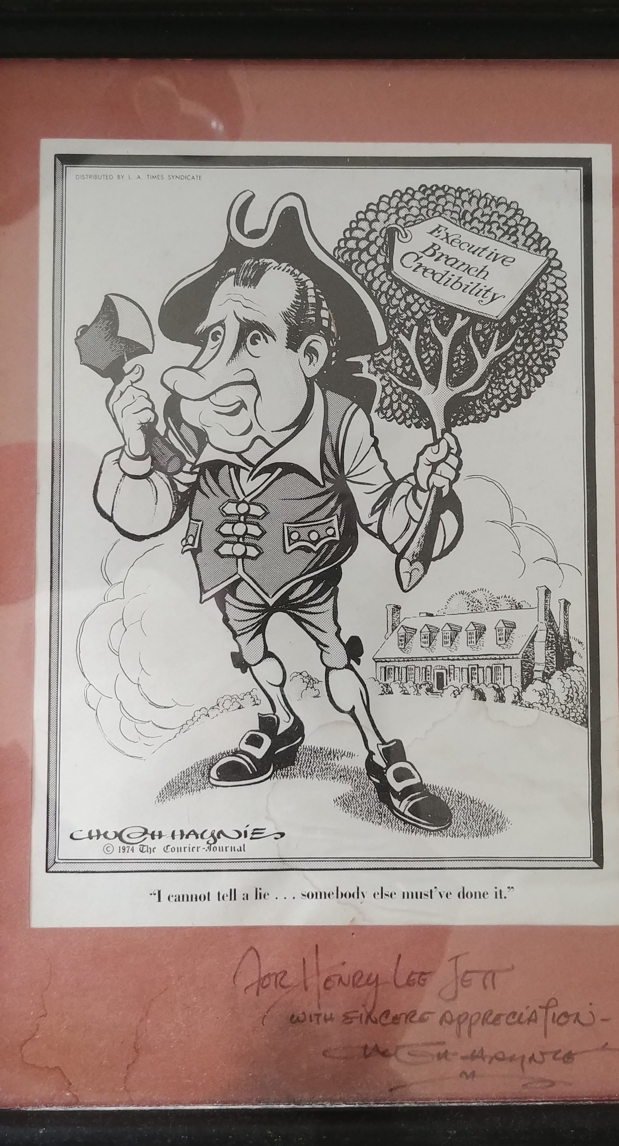 A framed political cartoon by Hugh Haynie who was a Reedville native. The cartoon is about Executive branch credibility and has the words "I cannot tell a lie...somebody else must've done it."