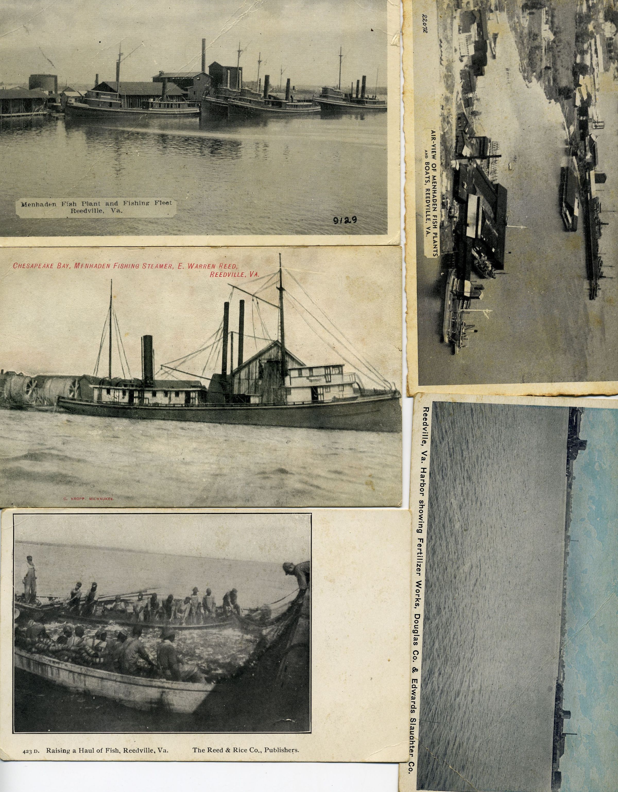 Selection of postcards with images of fishing, fish plants, fish boats incl,: Fertilizer Works, Douglas Co and Edwards Slaughter Company, menhaden fishing vessel E. Warren Reed; and aerial view of Reedville, McNeal Company, Morris Fisher Company, bailing fish, Douglas Company, FV Lancaster , Edwards and ReedCollection