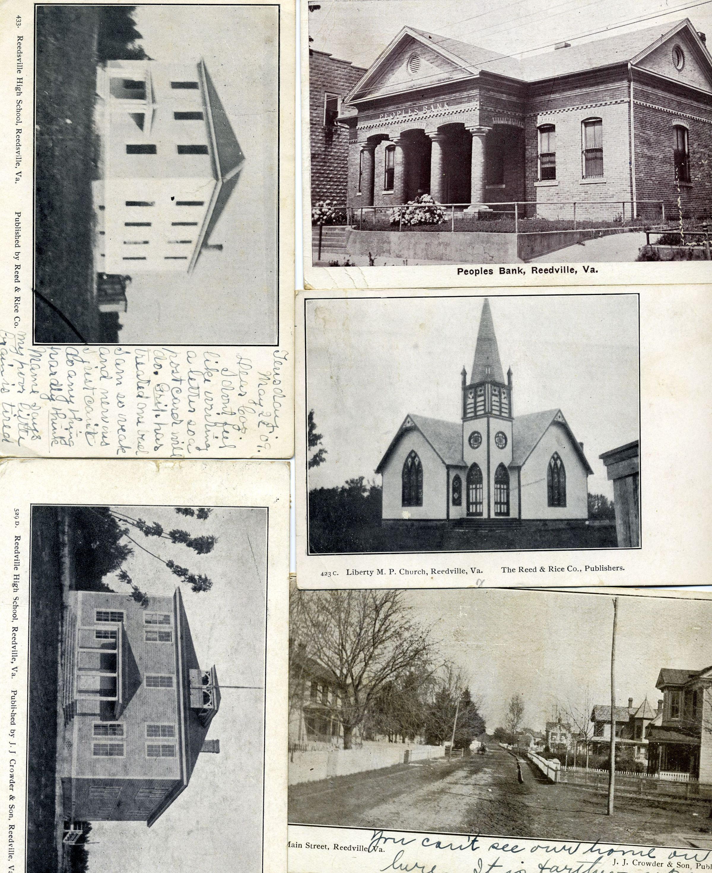 Selection of postcards with images of Reedville buildings including: People's Bank, Reedville School, Liberty Church, Bethany Church, aerial view of town, upper Main st view, Reedville shoreline,Main ST views lower, George Reed residence, the Gables., Reedville wharf with Palmer and Moore store and steamboat Piankatank, Reedville HS burning, Roseland Cemetery, Chesapekae Beach bathers and boaters cottages, Reedville wharfCollection