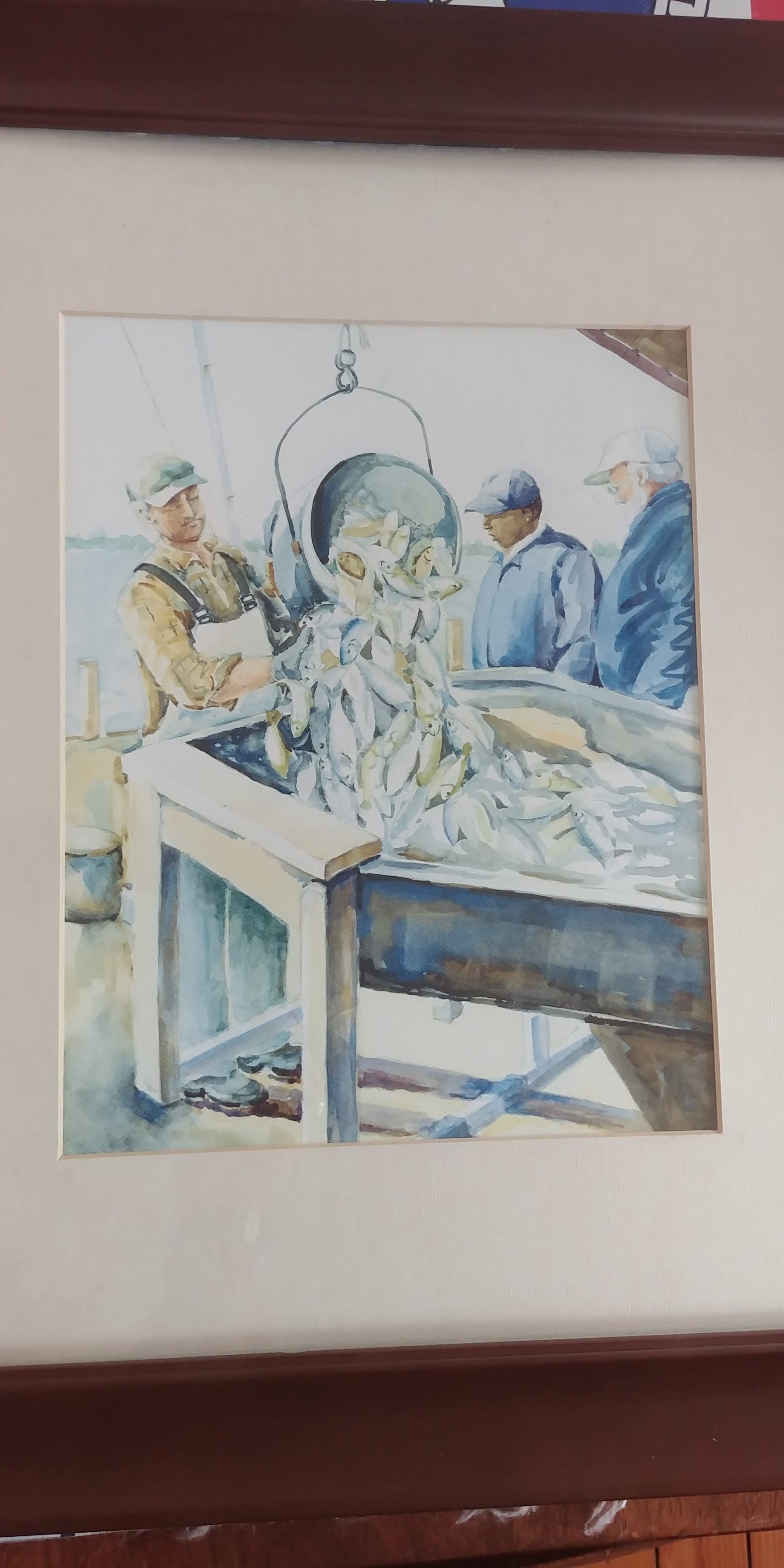 A watercolor of watermen sorting the catch by Constance de Bordenave.
