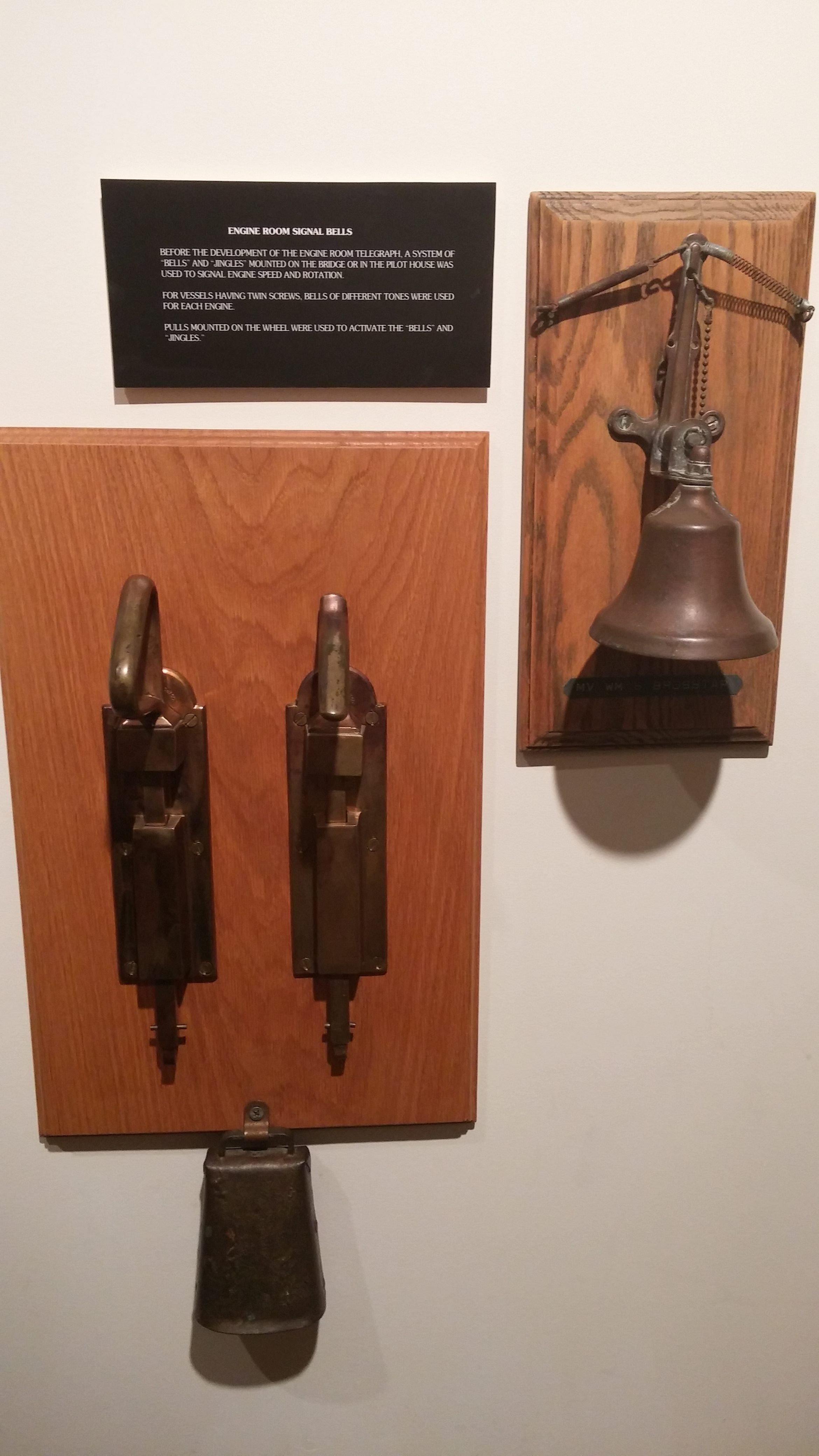 Brass 'jingle' bell to signal engine room all ahead full. 9" wide by 4" diameter, with steel clapper and 2 springs at the top connected to bridge pulley which activated the bell