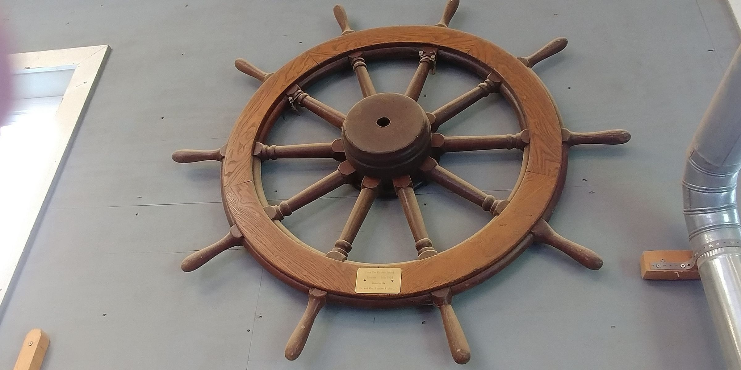 Ship's Wheel from the "Virginia"--Four feet in diameter, made of hard wood and brass. Original equipment of "Virginia" which was built in 1903 in Bordentown, New Jersey. When the "Virginia" retired and was stripped and sunk off Chincoteaque Island, Eugene W. Jett Sr. bought the entire pilot's cabin. After his death, his Son Gene Jett aquired this wheel.